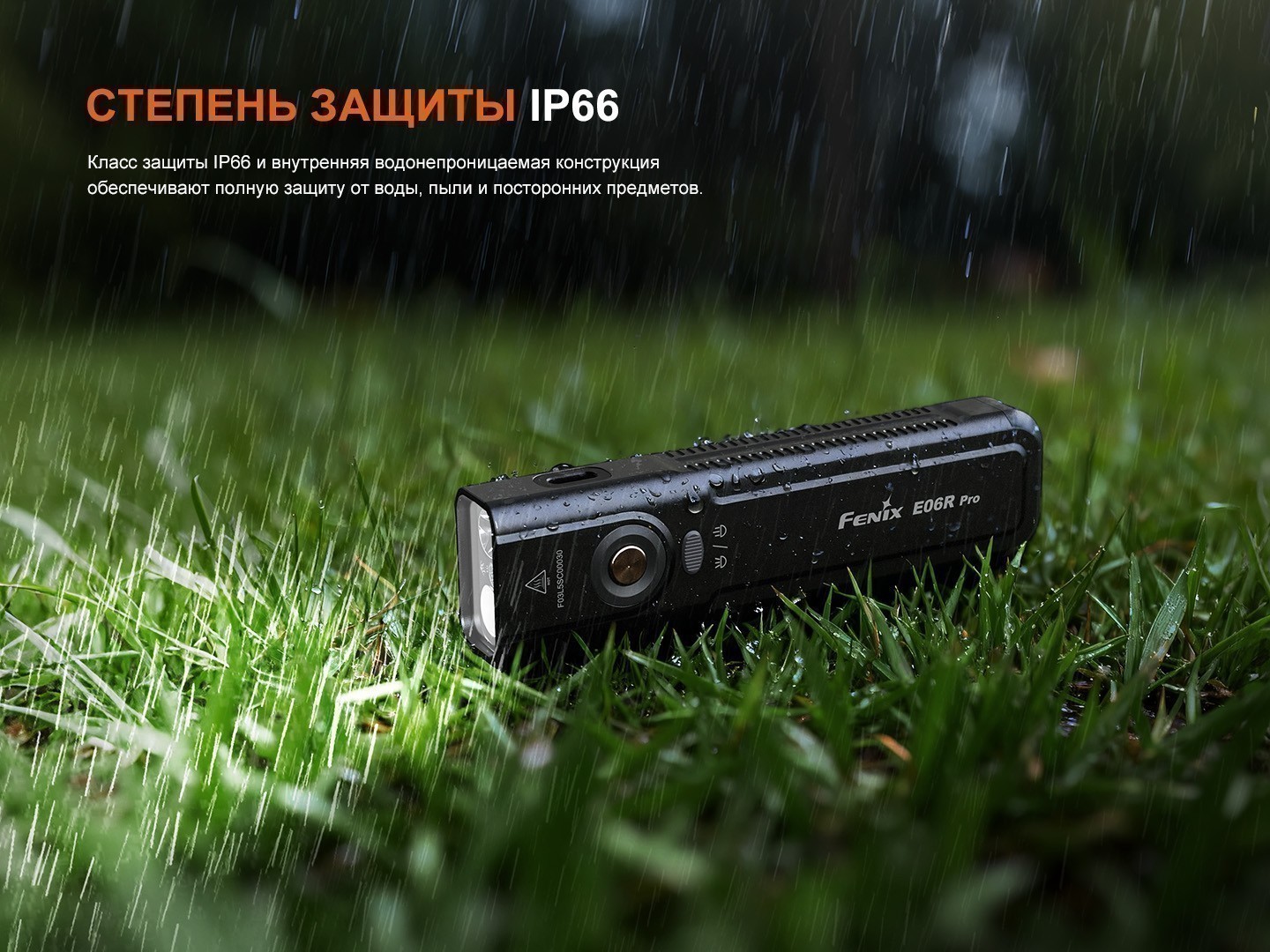 Корпус в оранжевом цвете выполнен из алюминиевого сплава и имеет защиту IP66. Это означает устойчивость к дождю, пыли и грязи. Фонарь Fenix E06R Pro представлен в трех цветах: классический черный, энергичный оранжевый и тактический зеленый.