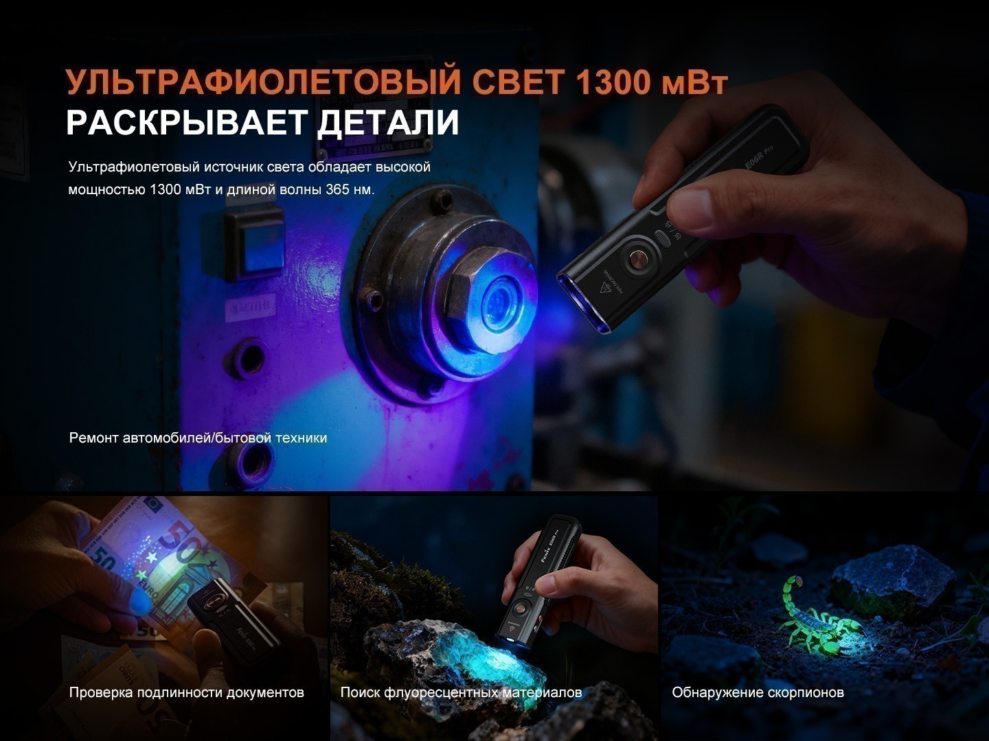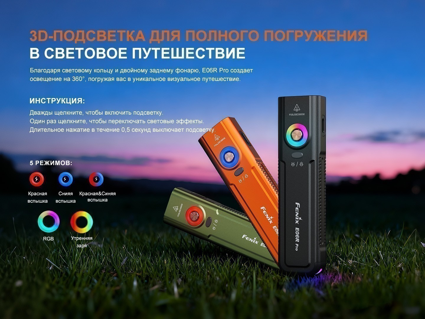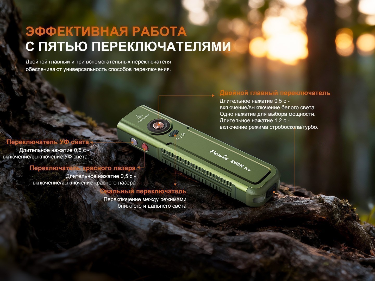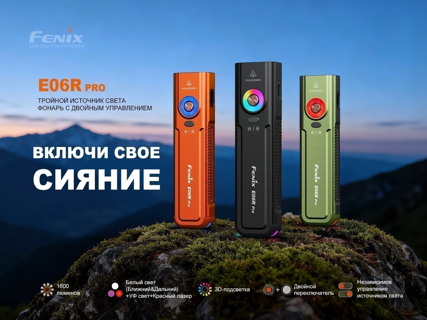Fenix E06R Pro оснащён несколькими видами света для разных задач. Белый дальний свет с чётким сфокусированным лучом,нейтральный ближний — с мягким рассеянным освещением; при необходимости их можно использовать одновременно в комбинированном режиме. Также в фонаре есть ультрафиолетовый свет, для проверки документов, ремонта техники и других специфических задач, красный свет — для работы в темноте без потери ночного зрения, и RGB-подсветка, которую можно использовать как сигнальную или декоративную. Дополняет функциональность красный лазер, позволяющий точно указывать объекты или подавать визуальный сигнал.