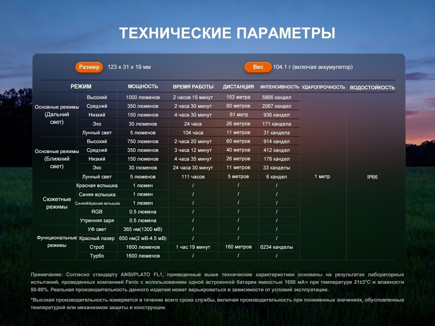 - Лунный свет — 5 люменов — 104 часа — 11 метров