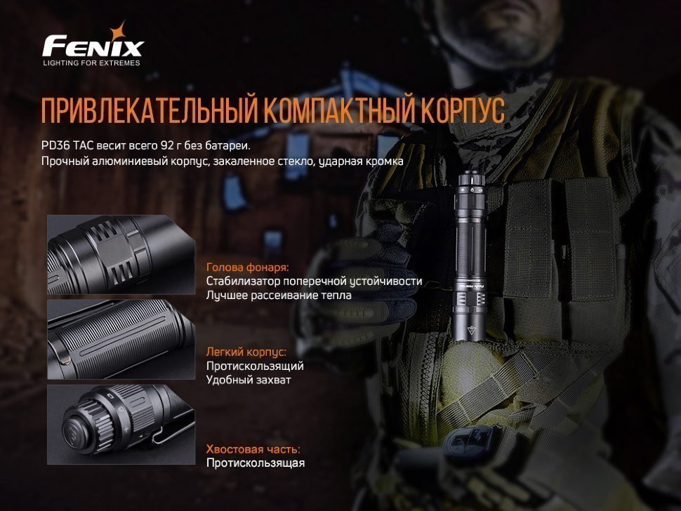 [PREVIEW_TEXT] => Фонарь модели Fenix PD36TAC это тактический прибор, который даёт максимальный световой поток в 3000 люменов, а расстояние действия достигает 274 метров. Применённый диод: Luminus SST70. Модель управляется при помощи запатентованной двухфункциональной кнопки, которая осуществляет моментальную тактическую активацию. Прочный корпус защищён от влаги и повреждений. Размеры фонаря: 140*26,5*25,4 миллиметра. Весит 92 грамма.