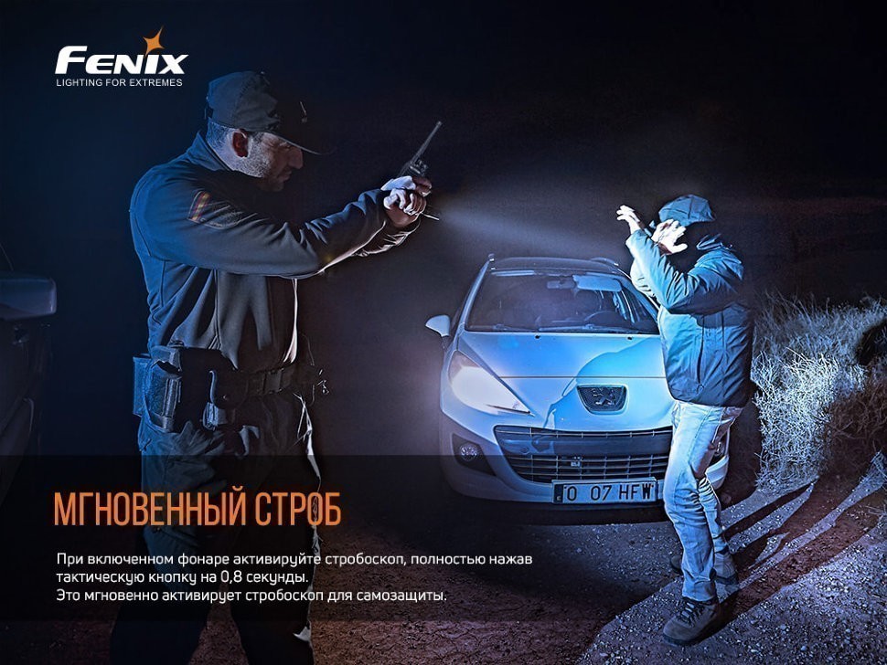 Модель фонаря Fenix PD36TAC является тактическим прибором, который пригодится вам в разных видах активного отдыха. Фонарь даёт максимальный световой поток в 3000 люменов, а его расстояние действия составляет 274 метра. Используемый светодиод – Luminus SST70. Срок эксплуатации такого диода достигает 50 тысяч часов. В наборе вместе с фонарём предусмотрен литий-ионный аккумулятор 21700. Управляется модель при помощи запатентованной двухфункциональной кнопки, которая осуществляет моментальную тактическую активацию.