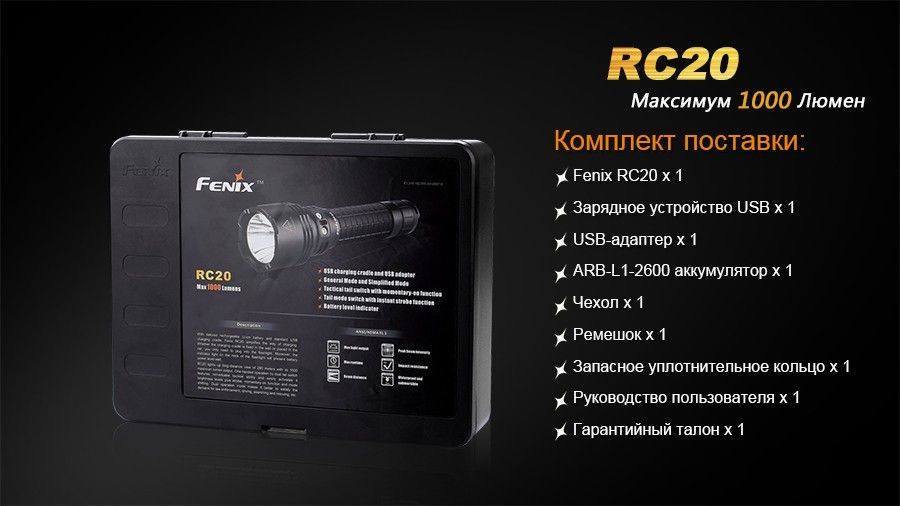 Гарантия: Для фонарей Hi-End класса Fenix RC20 гарантийный период определен на уровне 2 лет с даты их продажи.