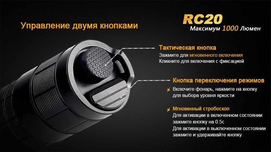 Управление осуществляется при помощи двух кнопок. Чтобы включить/выключить фонарь Fenix RC20, нажмите до упора на круглую кнопку. Если же нажать на нее до половины и удерживать, активируется функция моментального включения. В этом случае Fenix RC20 будет работать до тех пор, пока пользователь будет держать кнопку нажатой.