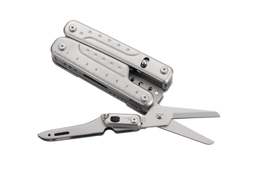 Открывать инструменты можно буквально одной рукой, что быстро и удобно. За одно движение можно извлечь и применить сразу 7 часто используемых функций, и сделать это легко, даже будучи в перчатках. Ножницы модели достаточно велики и безопасны, с ними достаточно просто работать, и можно перерезать довольно толстые верёвки или канаты. Рукоять у ножниц имеет замок-переключатель для устойчивой работы инструментом. Форма лезвия ножа в мультитуле – Tanto, нож нуждается в приобретении дополнительно различных лезвий. Можно выполнять самые разные работы, используя для них тот или иной тип клинка, и оптимизируя тем самым процесс.