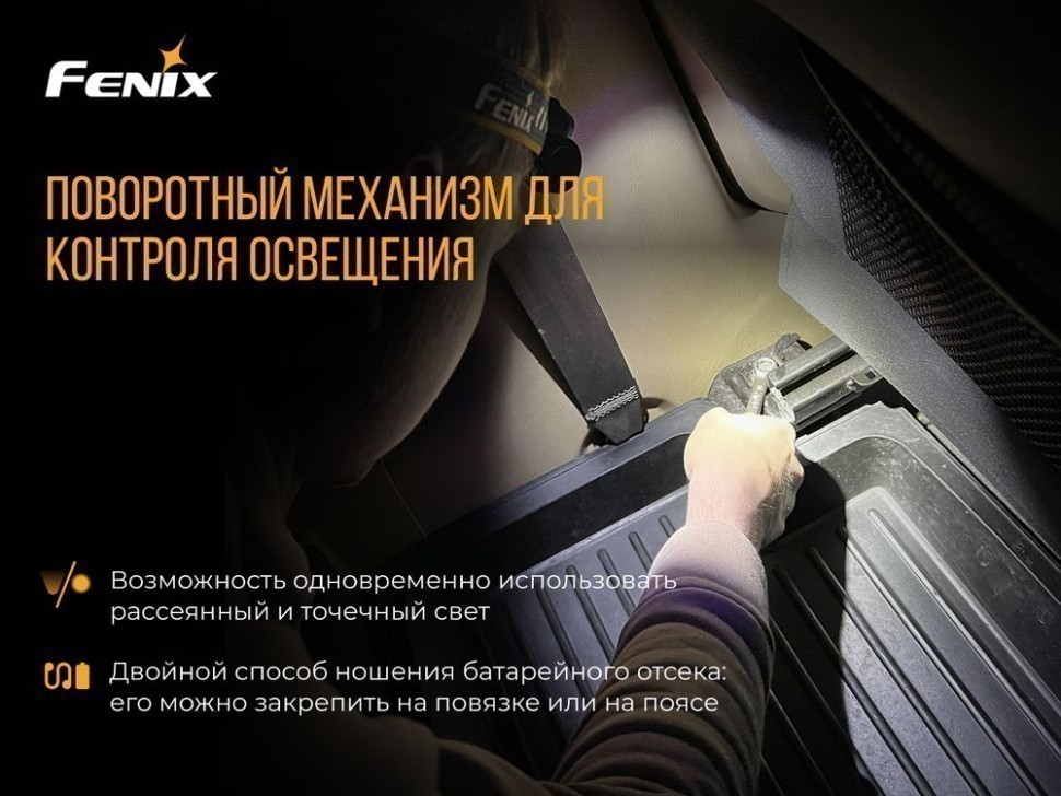 Характерная черта модели – способность одновременно задействовать как рассеянное, так и сконцентрированное освещение. Тем самым достигается адаптируемый свет. Для запуска режима ближнего-дальнего освещения предусмотрен поворотный переключатель. Двойной интерфейс для зарядки и разрядки. Двойной способ ношения батарейного отсека: его можно закрепить на повязке или на поясе.