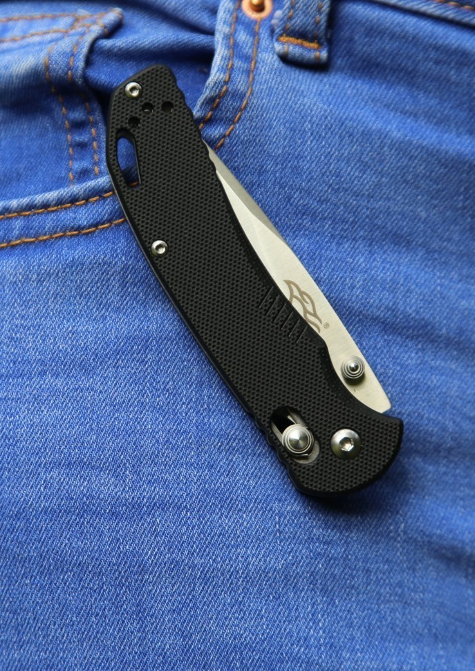В открытом положении, размер модели Firebird F753M1 равен 17.8 см. Рукоятка этого ножа выполнена с использованием композитного материала G10. Он получен путем соединения стекловолокна с эпоксидными смолами. Этот материал совсем легкий, но по прочности практически не уступает стальной основе рукоятки. Мелкая текстурная накатка на стеклопластике помогает крепко держать нож в руках. Кроме того, нож можно дополнительно пристраховать при помощи темляка, который, при желании, вдевается в отверстие на ручке Firebird F753M1. Клипса же, используемая для ношения на ремне, изготовлена из стали.