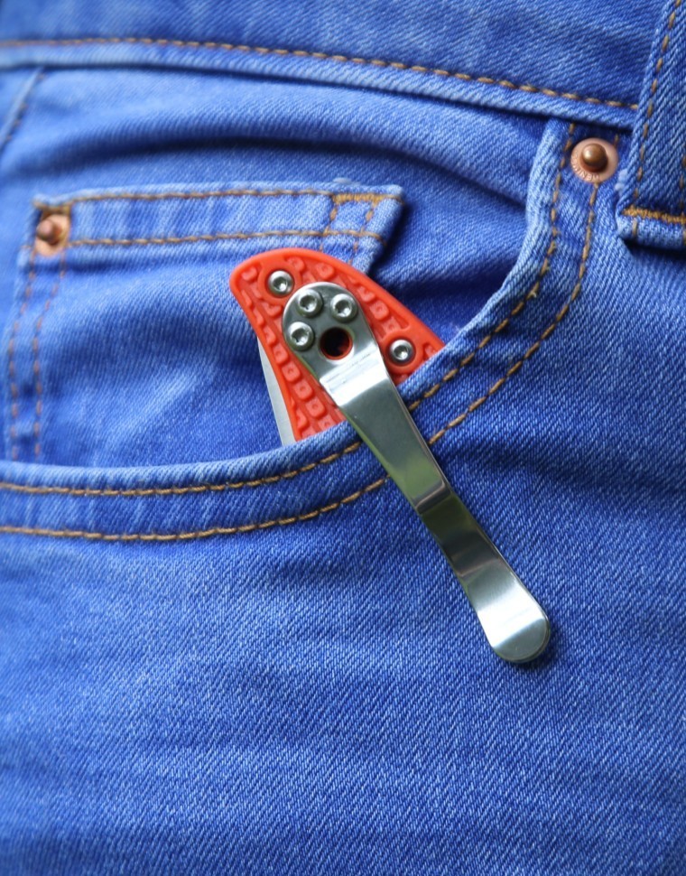 Не менее эффектна и сделанная из наполненного стекловолокном нейлона ручка ножа. Она может быть окрашенной в черный, голубой, оранжевый или розовый цвет (вариант покупатель выбирает сам). Помимо накатки для препятствия скольжению, на ее поверхность нанесен логотип бренда. Кроме того, к ручке ножа прикручена клипса, чтобы пользователь мог носить его на ремне. Положение этой клипсы также можно регулировать на собственное усмотрение.