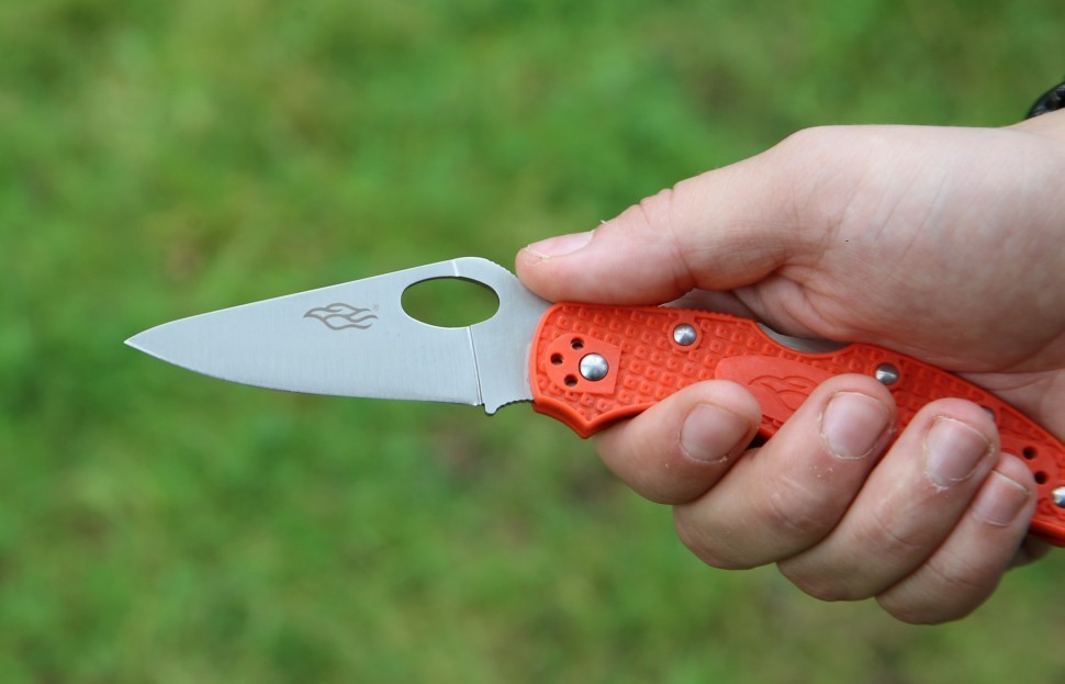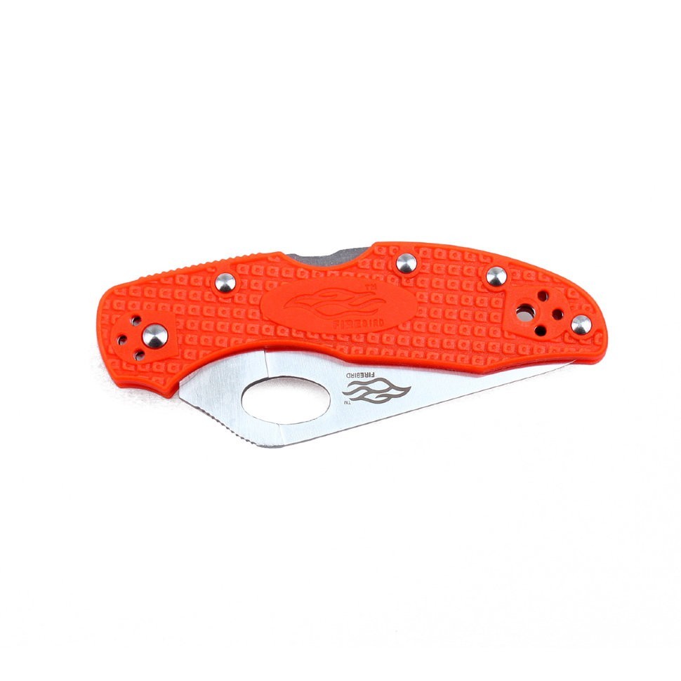 Лезвие Firebird F759M сделано из стали 440С — одной из самых востребованных в сфере производства ножей. Это нержавеющая сталь с таким балансом составляющих элементов, что она может очень долго быть острой после заточки. Режущая кромка ножа с заводского конвейера поступает уже качественно заточенной и полностью ровной. В дальнейшем, ухаживать за таким ножом можно и при помощи домашних точильных инструментов, выполняя заточку самостоятельно. Дизайн Firebird F759M предполагает, что вместо шпенька для открытия клинка будет использоваться отверстие на лезвии. Поэтому часть клинка около рукоятки выступает за пределы высоты ручки ножа. В открытом виде лезвие выглядит очень оригинально.