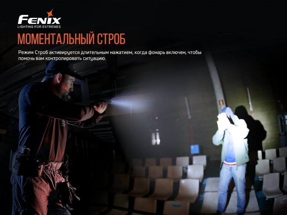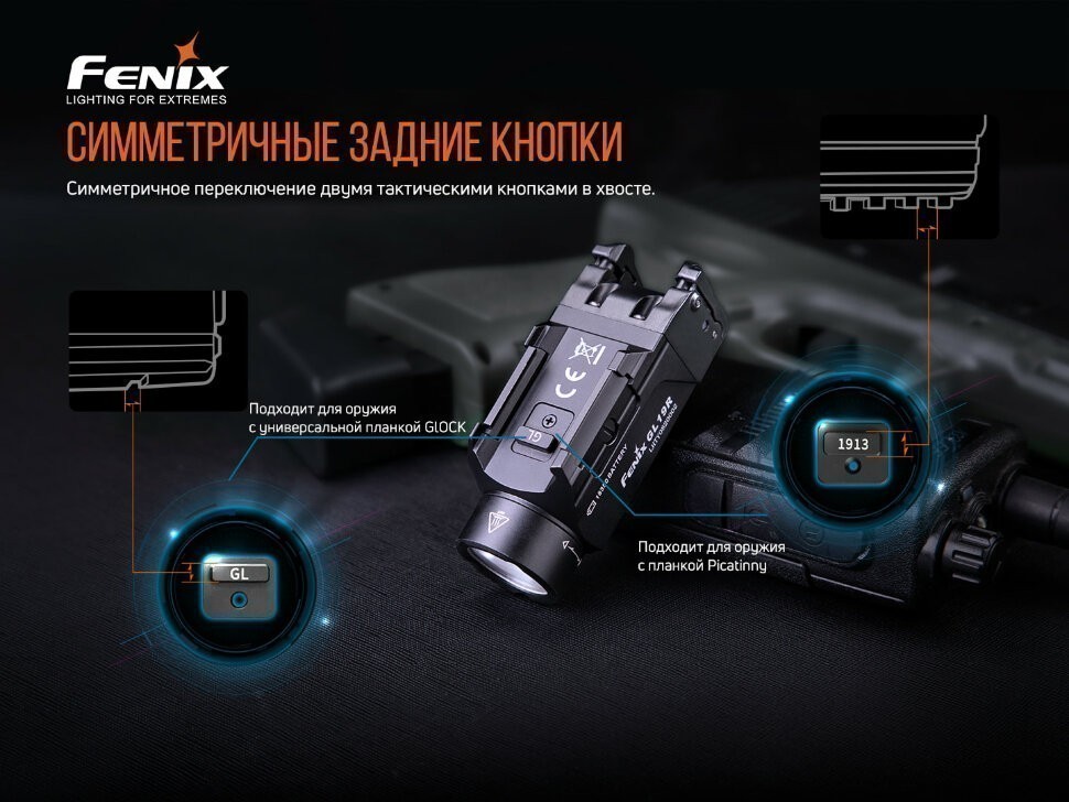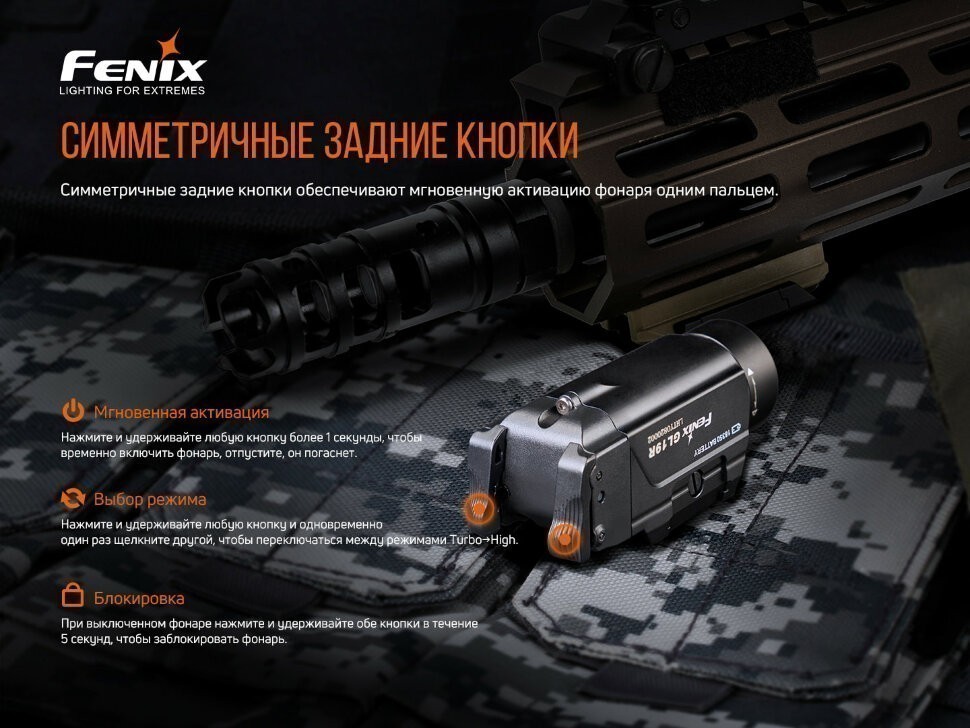 Модель Fenix GL19R представляет собой мощный аккумуляторный фонарь для тактических целей. Его разработали специально для того, чтобы улучшать видимость и возможности прицеливания при стрельбе. GL19R достаточно компактный по размерам и практически неразрушимый, обеспечивает интенсивное белое освещение яркостью 1200 люменов. Дистанция луча достигает 210 метров. Его можно быстро зафиксировать как на универсальной направляющей, так и на планке Пикатинни при помощи запатентованного рычага QD. Двусторонние задние кнопки обеспечивают моментальное управление одним пальцем кратковременного или постоянного включения. Режим стробоскопа можно запустить длительным нажатием при включенном свете, чтобы помочь вам контролировать ситуацию.