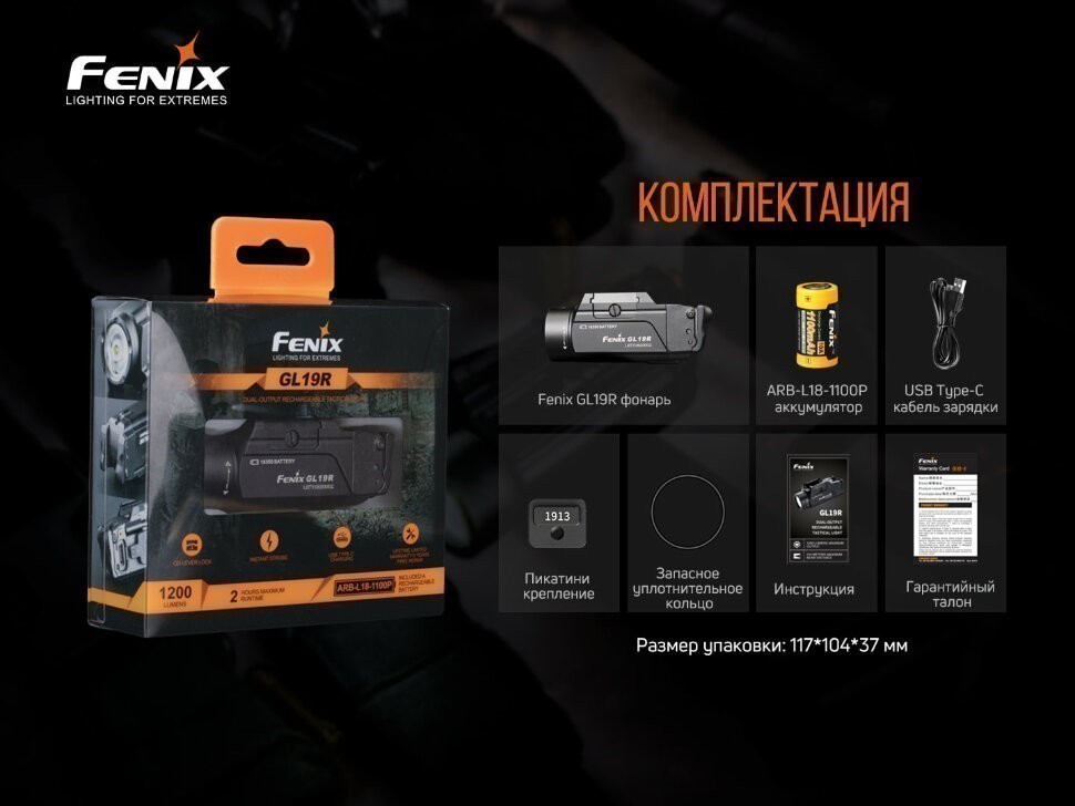 Модель фонаря Fenix GL19R, литий-ионный аккумулятор Fenix ARB-L18-1100P, кабель для зарядки USB Type-C, планка Пикатинни, запасное уплотнительное кольцо, инструкция пользователя, талон гарантии.