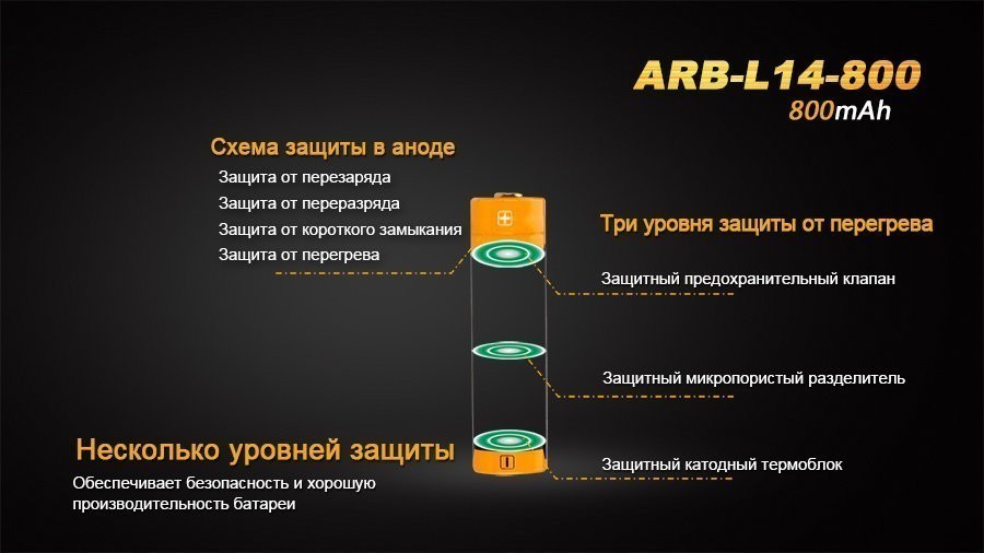 Аккумулятор модели ARB-L14-800 накапливает 800 мАч заряда и подходит для самых разных приборов. В том числе, производители рекомендуют выбрать его для фонаря Fenix LD11. Заряжать этот элемент питания лучше всего при помощи зарядного устройства Fenix ARE-С2.