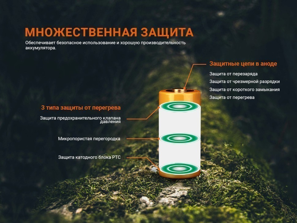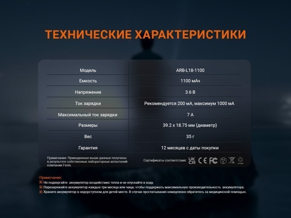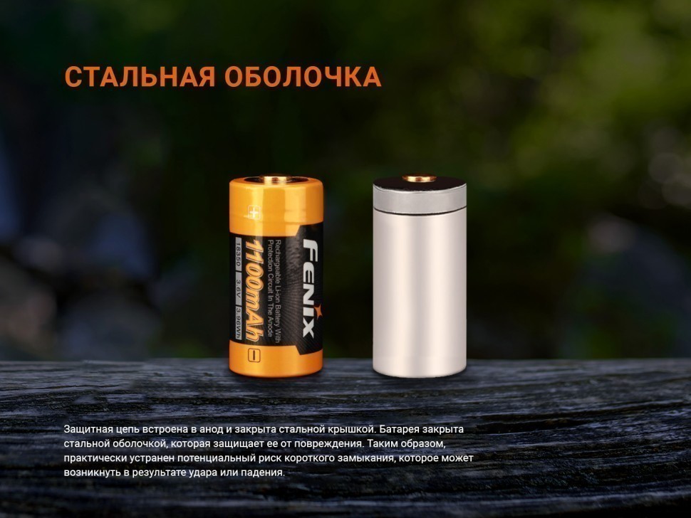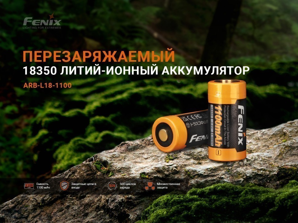Fenix 18350 ARB-L18-1100 — перезаряжаемый литий-ионный аккумулятор емкостью 1100 мАч. Это надежный и безопасный аккумулятор с форм-фактором 18350, отлично подходящий для фонарей Fenix, например для моделей GL19R V2.0, TK05R, GL23R, GL19R.