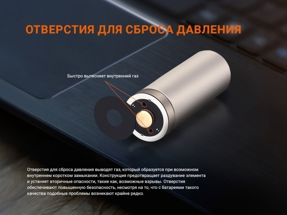 В конструкции предусмотрены специальные отверстия для сброса избыточного давления — они выполняют роль предохранительных элементов при возможном возникновении внутренних коротких замыканий. Через них отводится выделяющийся газ, предотвращается деформация и раздувание аккумулятора. Стальной корпус аккумулятора защищает его от повреждений.