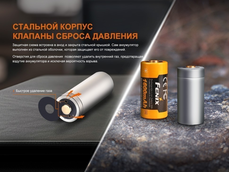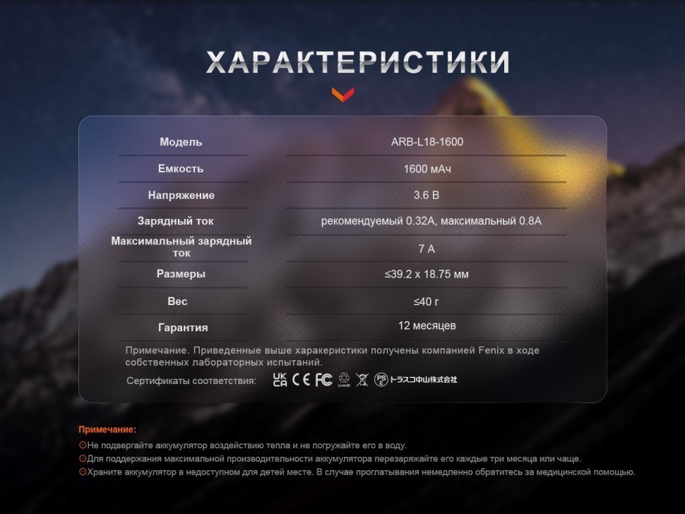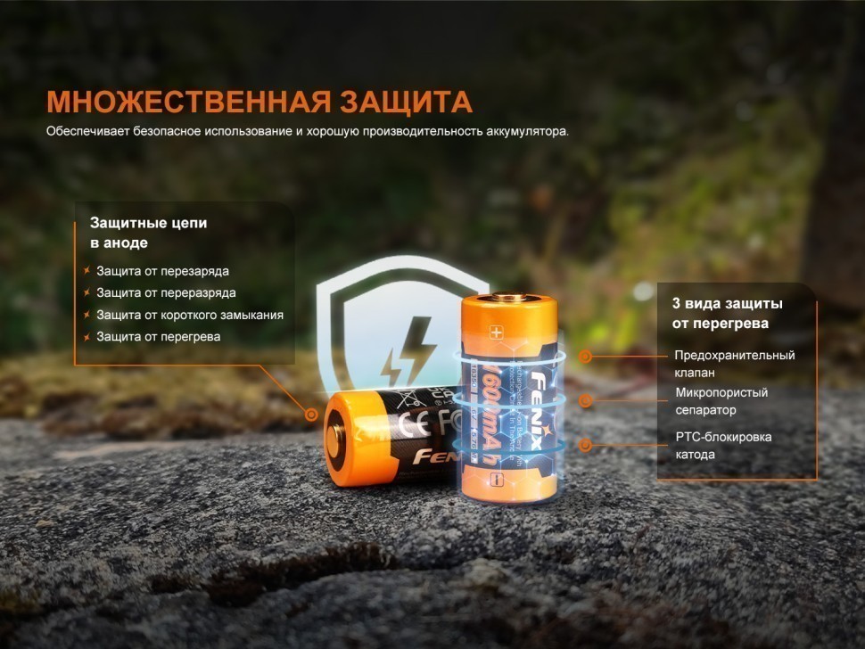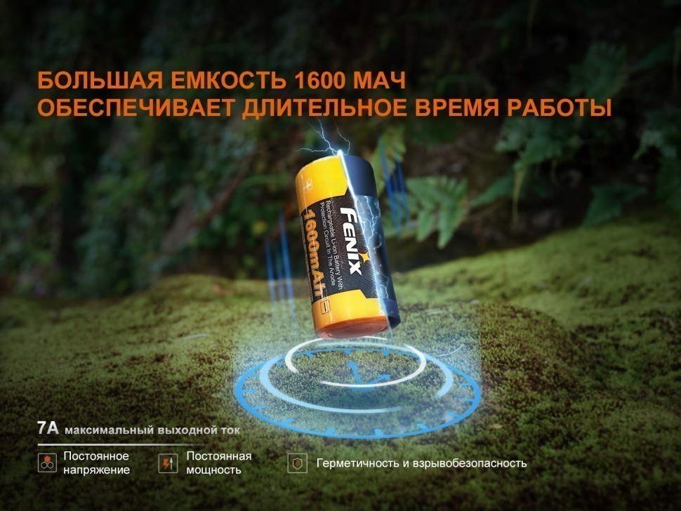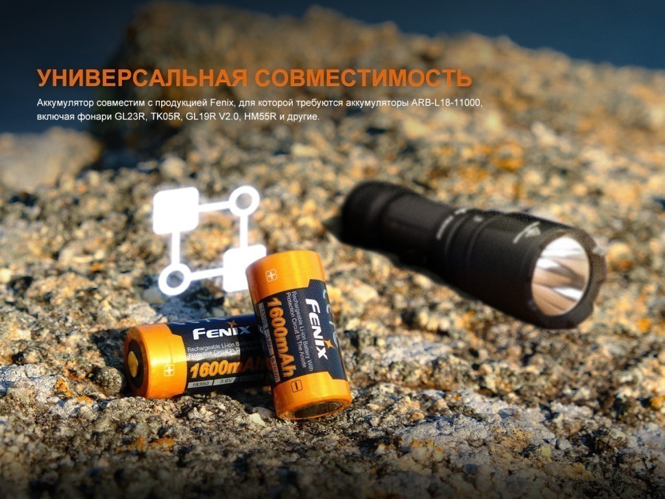 Это надежный источник питания формата 18350 с увеличенной емкостью 1600 мАч, разработанный для совместимости с фонарями Fenix серий GL19R V2.0, GL23R, HM55R и TK05R.