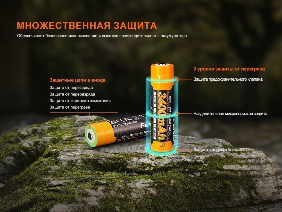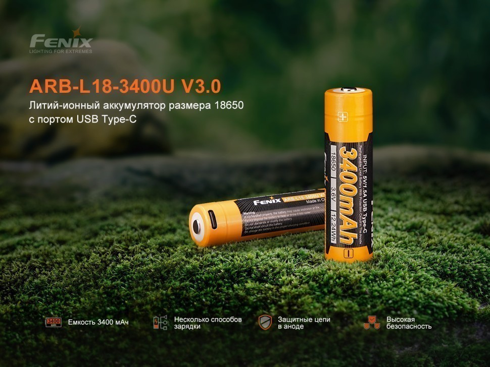 Fenix ARB-L18-3400U V3.0 — высокопроизводительный литий-ионный аккумулятор стандартного размера 18650. Перезаряжаемая батарея обладает высокой емкостью 3400 мАч, которая обеспечивает длительное время работы устройств. Элемент питания подходит для ручных, налобных, кемпинговых фонарей и других электронных приборов, которым требуются аккумуляторы 18650.