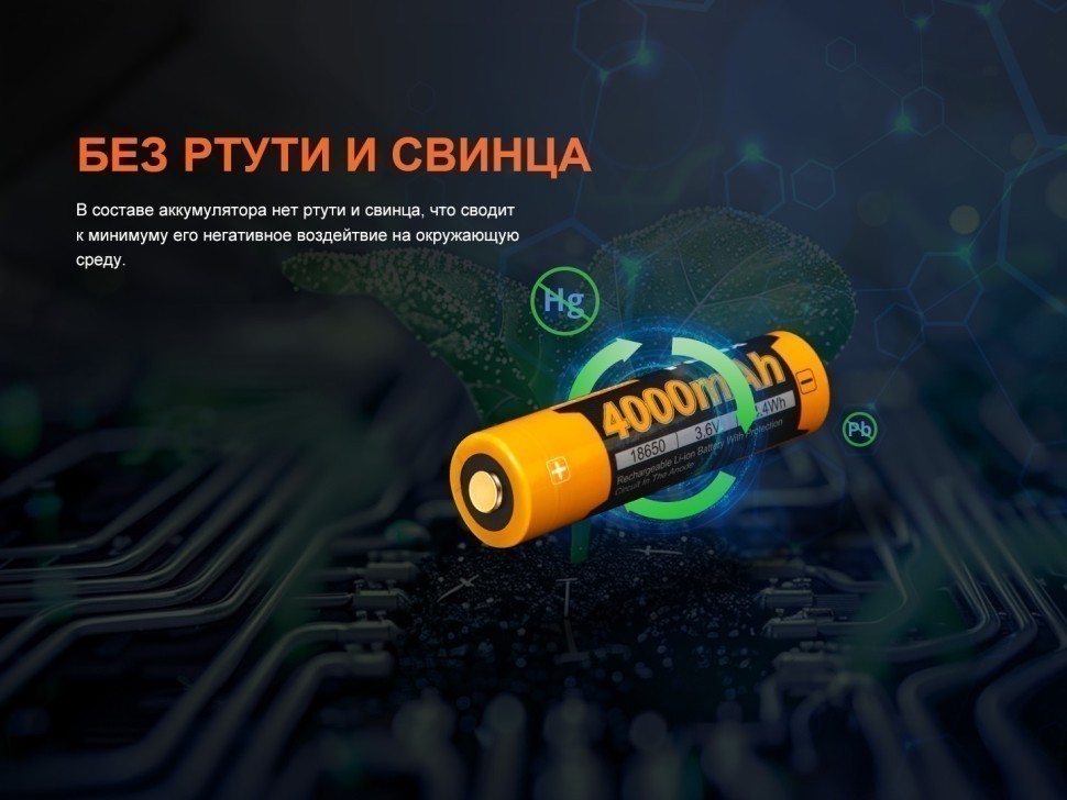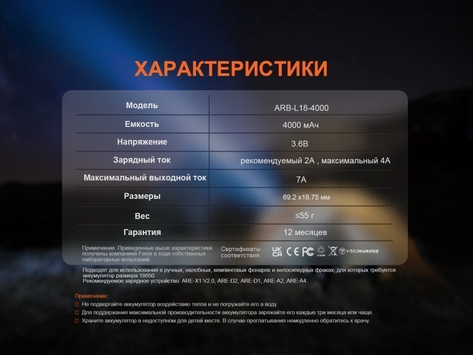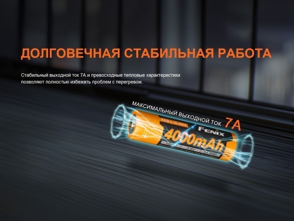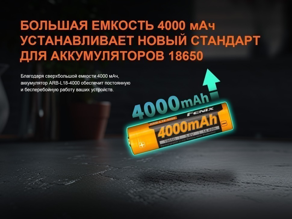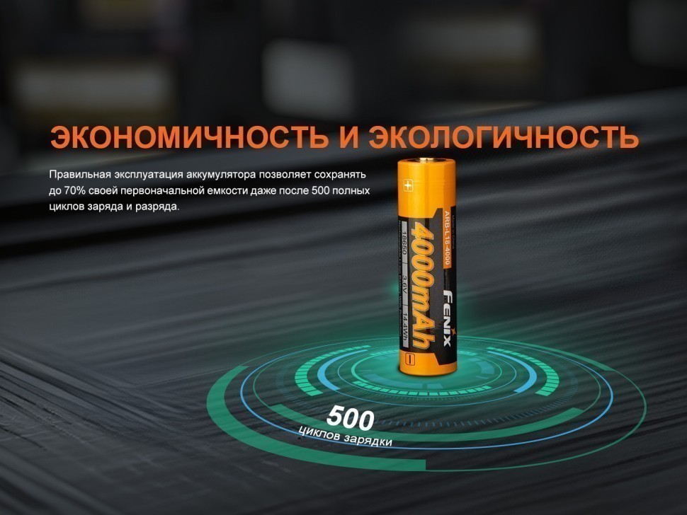 Fenix ARB-L18-4000 — высокопроизводительный перезаряжаемый литий-ионный аккумулятор стандартного размера 18650. Перезаряжаемая батарея обладает высокой емкостью 4000 мАч, которая обеспечивает длительное время работы электронных устройств. Элемент питания подходит для мощных фонарей Fenix, а также для другого оборудования с аккумулятором 18650.
