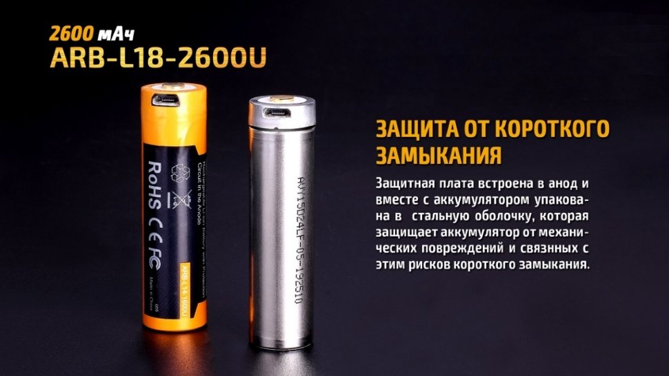 Аккумулятор ARB-L18-2600U существенно отличается от других моделей, предлагаемых не только брендом Fenix, а и остальными производителями. Этот литий-ионный элемент питания оснащен необычным элементом — портом микро-USB. Он используется для повторной зарядки батареи непосредственно от источников питания через кабель. В то же время, пользователи вполне могут применять для этих целей одно из стандартных зарядных устройств. В том числе, совместимые модели зарядок предлагает и Fenix.