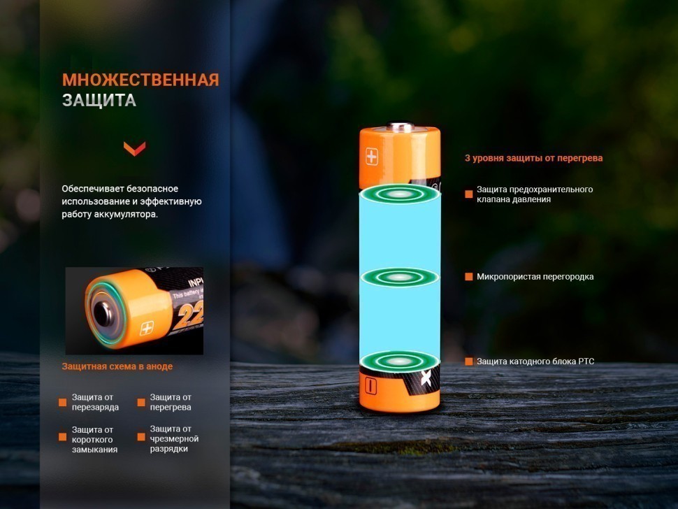 Литий-ионный аккумулятор Fenix ARB-L14-2200U обеспечивает стабильную работу и оснащен надежной системой безопасности. Он включает три уровня защиты от высокой температуры, а также защиту от перезаряда, переразряда и коротких замыканий. Стальной корпус аккумулятора защищает его от повреждений.