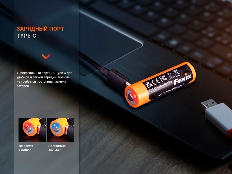 Особенностью Li-ion аккумулятора является наличие встроенного USB-порта. Благодаря этому заряжать его можно не только через специальный адаптер или с помощью фонаря Fenix, а напрямую с помощью провода Type-C. Для отслеживания уровня заряда предусмотрен индикатор, который загорается синим цветом, когда аккумулятор полностью заряжен.