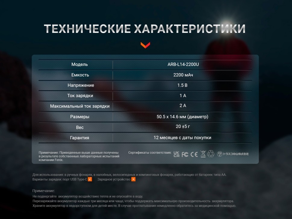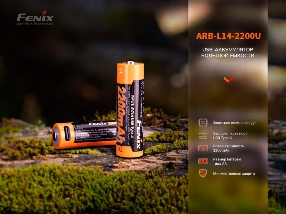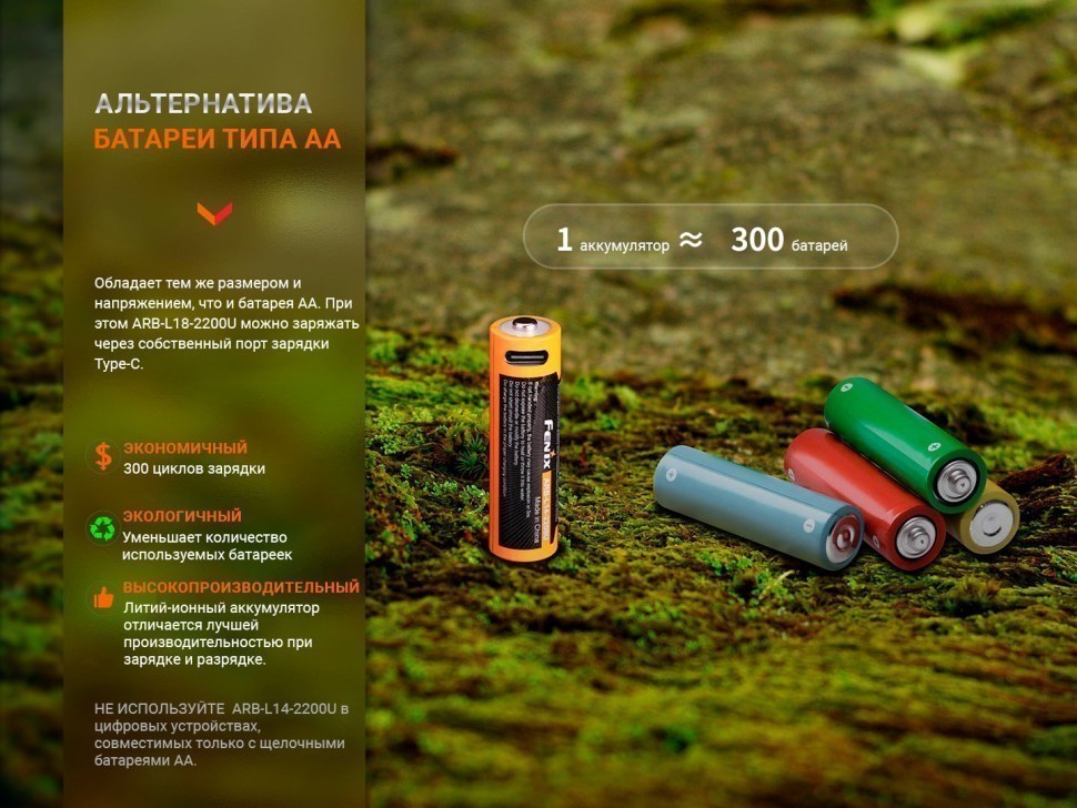 Fenix ARB-L14-2200U — перезаряжаемый аккумулятор форм-фактора 14500, который по размеру соответствует обычной батарейке АА.