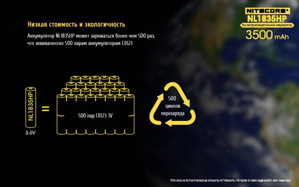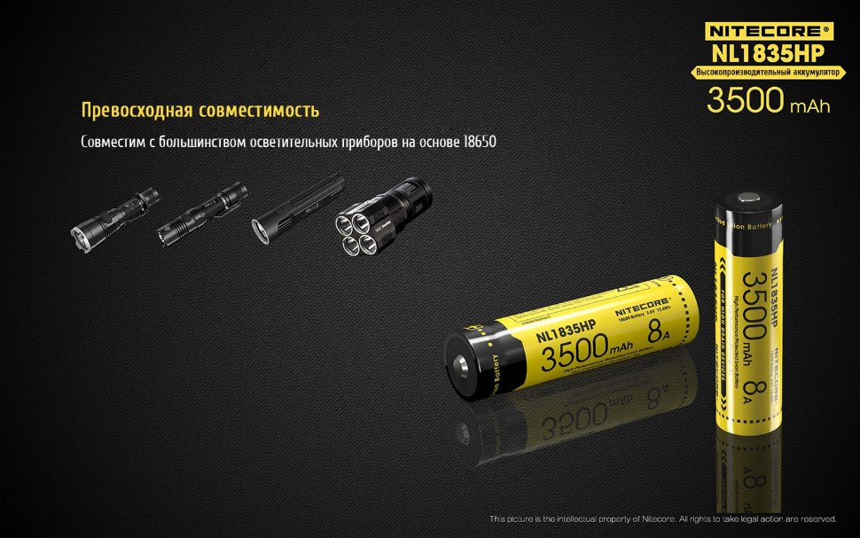 NL1835HP рассчитан на 500 полных циклов разряда и заряда. Также совместим с большим количеством осветительных приборов, которые работают на источнике питания типоразмера 18650.