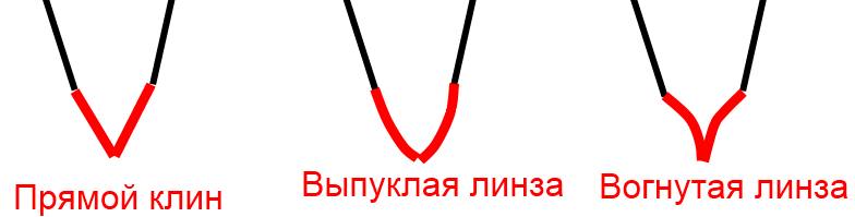 Если смотреть на лезвие в анфас, сверху, то можно увидеть что топор может иметь выпуклую, вогнутую или плоскую форму (подводы от режущей кромки к обуху). У каждой формы есть свои достоинства и недостатки.