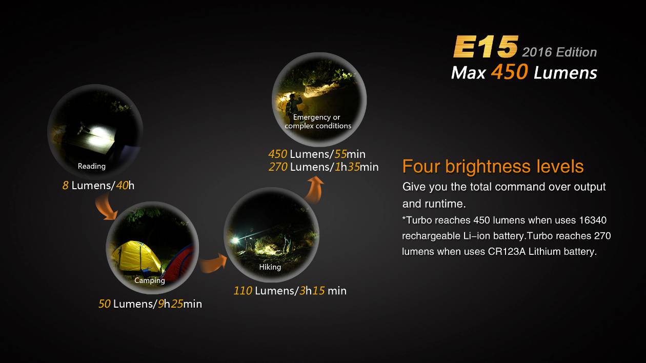 Каждая перевыпущенная компанией Fenix модель фонаря становится ярче и удобнее своей предыдущей редакции. Но Fenix E15 2016 действительно удивил теми преобразованиями, которые выпали на его долю. Что заметно сразу, так это увеличенная до 450 люмен яркость вместо 170 люмен, как это было раньше.