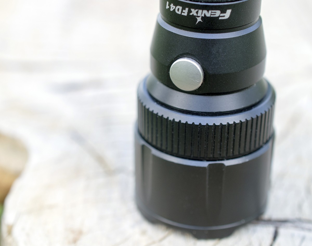 Элементы управления моделью Fenix FD41 представлены двумя кнопками. В торце фонаря находится кнопка включения, а на боковой поверхности корпуса — переключатель для выбора нужного режима освещения. Причем, торцевая кнопка вынесена выше уровня металлических деталей корпуса, а потому стоять наподобие свечи Fenix FD41 не сможет.