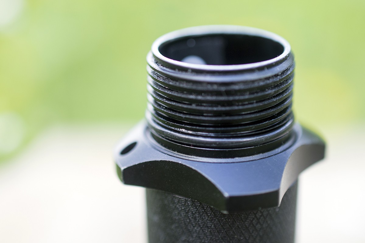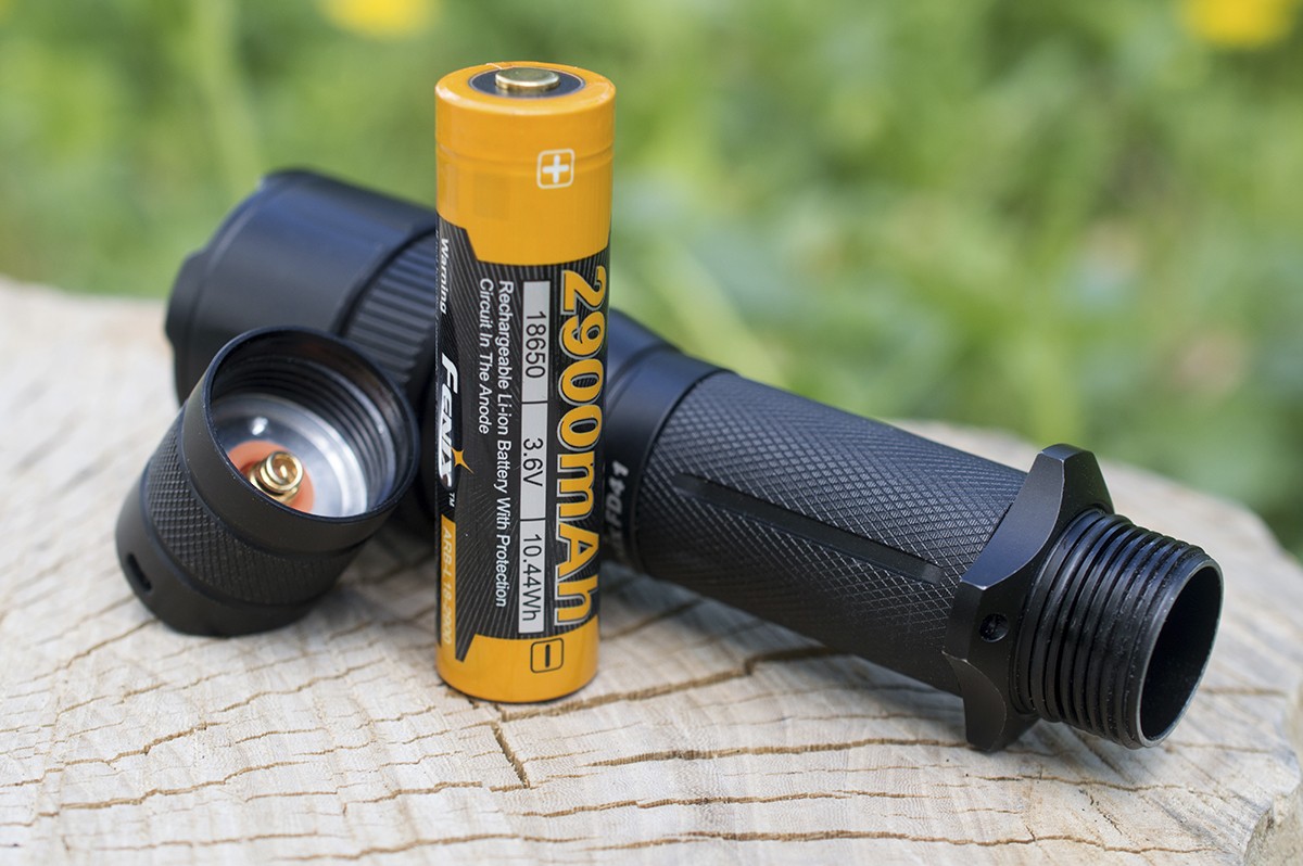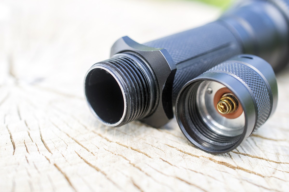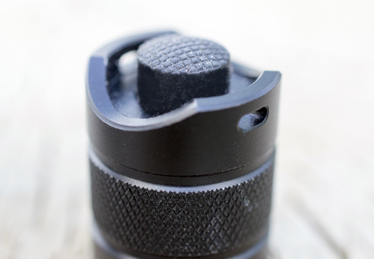 Фонарь нуждается в одном аккумуляторе 18650 или двух батарейках CR123A. Чтобы установить элементы питания, следует открутить хвостовую часть. Резьба выполнена аккуратной и практически полностью покрыта анодированием. Поэтому можно только немножко открутить фонарь, чтобы предотвратить его случайное включение во время транспортировки.