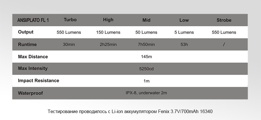 Немаловажно и то, что фонарь Fenix RC09Ti очень хорошо защищен от воды. Его без проблем можно включать во время дождя и мыть под водою. Поэтому такая миниатюрная модель будет вам полезна не только в городе, но и во время поездок на природу.