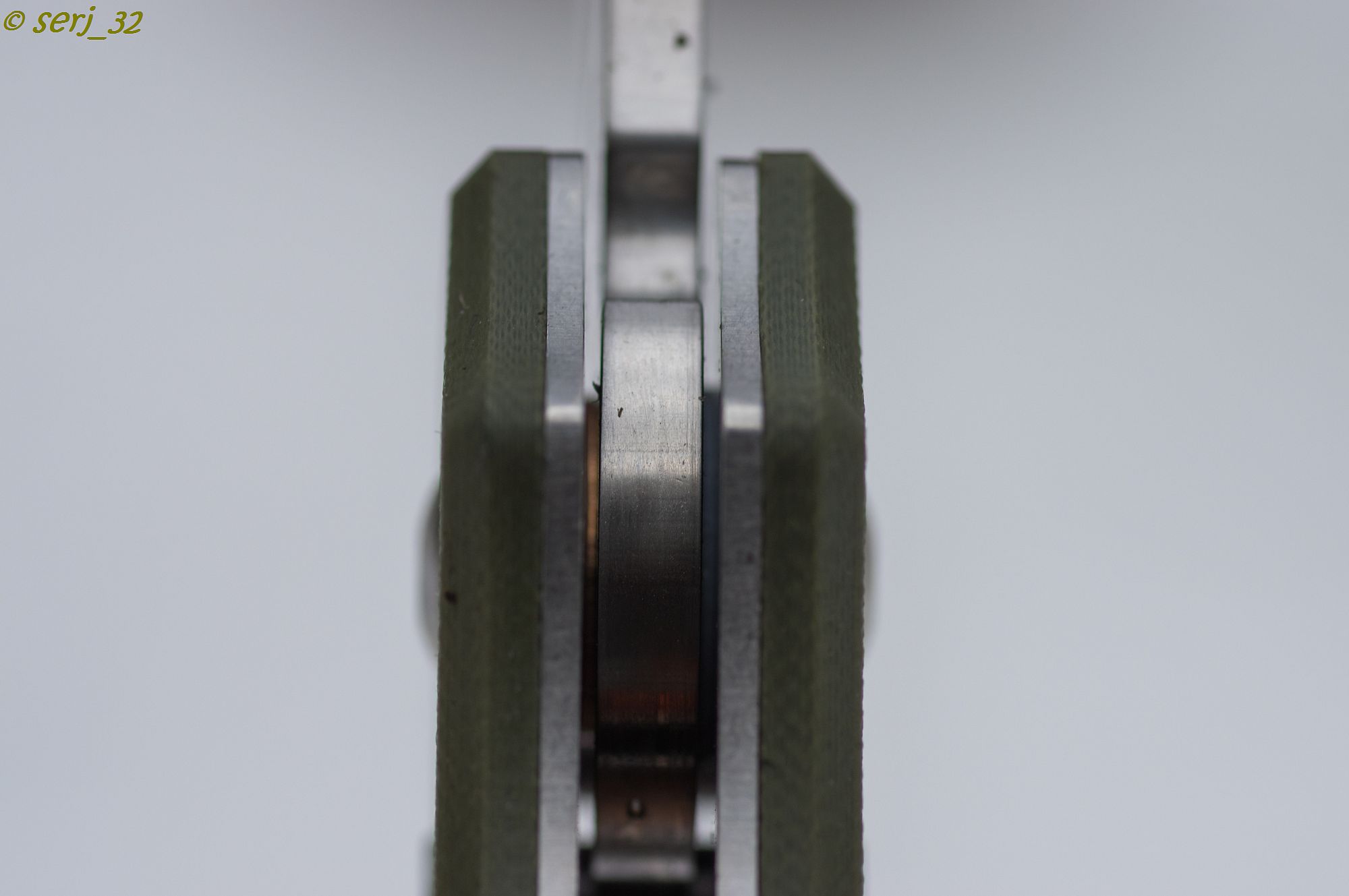 Конструктивно здесь использованы те же самые материалы, что и в других моделях. Накладки на рукоять - из стеклопластика. На оси клинка стоят 2 шайбы, но они разные: одна - из фторопласта, а вторая - латунная. Клипса может устанавливаться на рукоять с 2-х сторон.