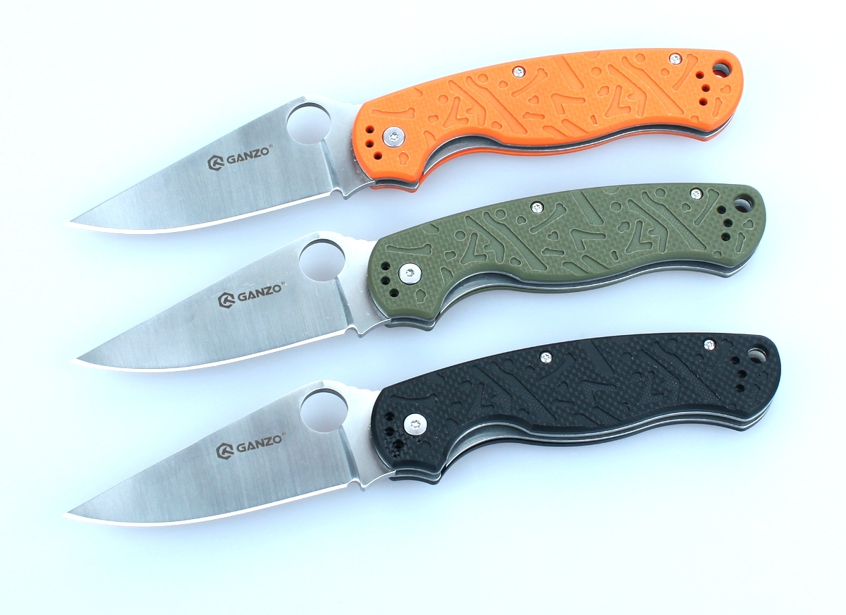 Что касается дизайна рукоятки, то он остался вполне в стиле Ganzo. Сделана рукоятка из стеклопластика G10, популярного сейчас благодаря прочности, пластичности и долговечности. На нее нанесен рисунок, названный «короед». Конечно же, покупатели могут выбрать понравившийся цвет из нескольких вариантов: оранжевый, черный, зеленый.