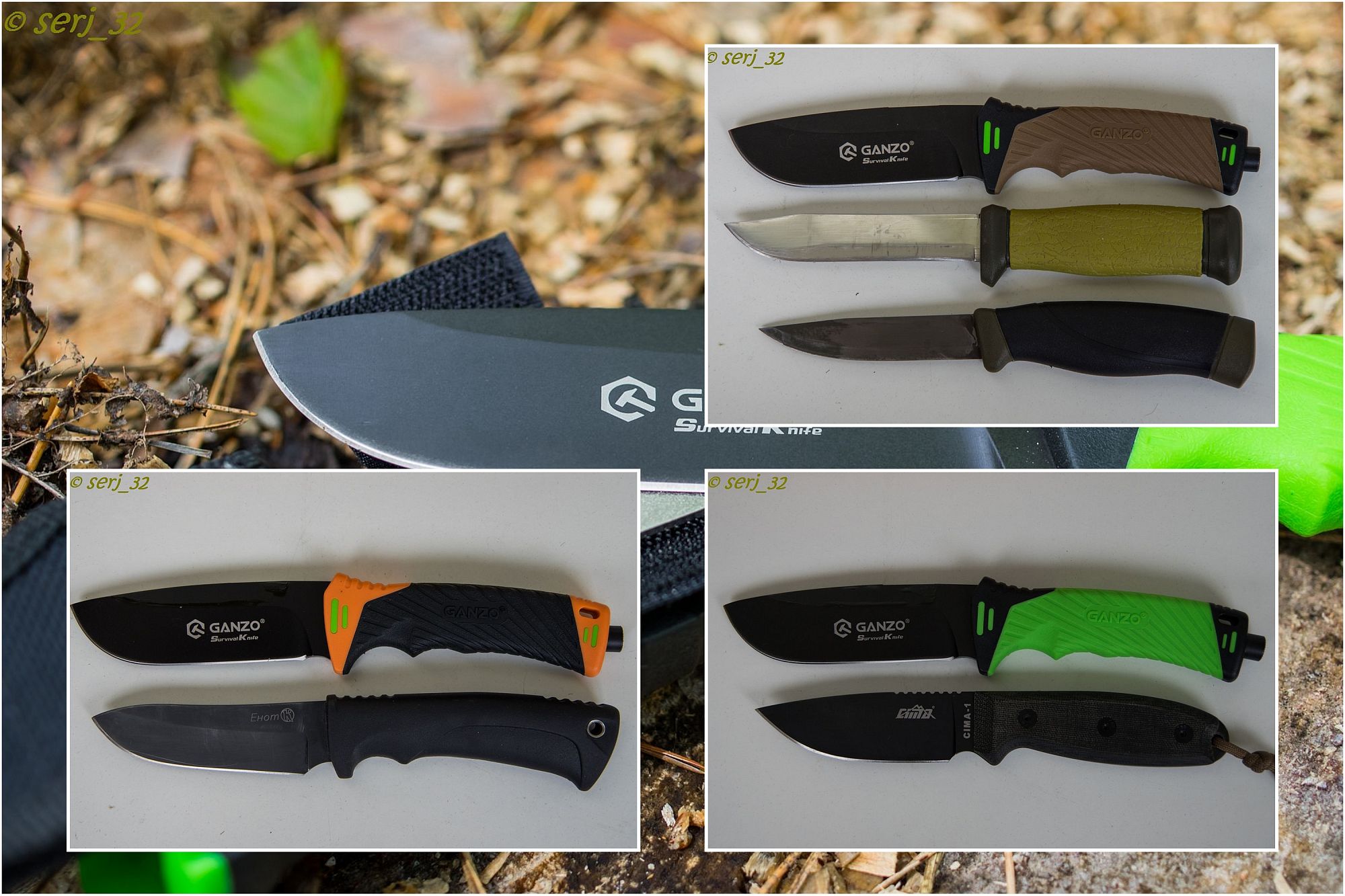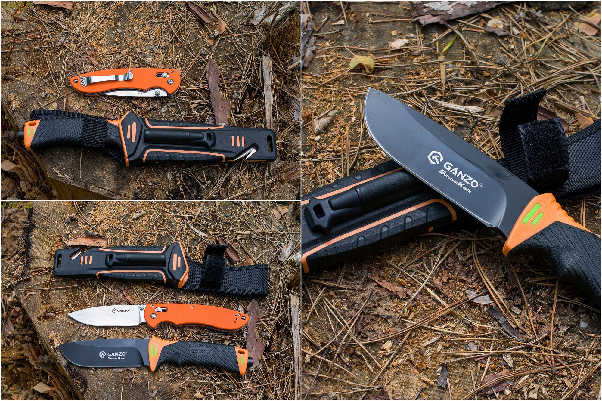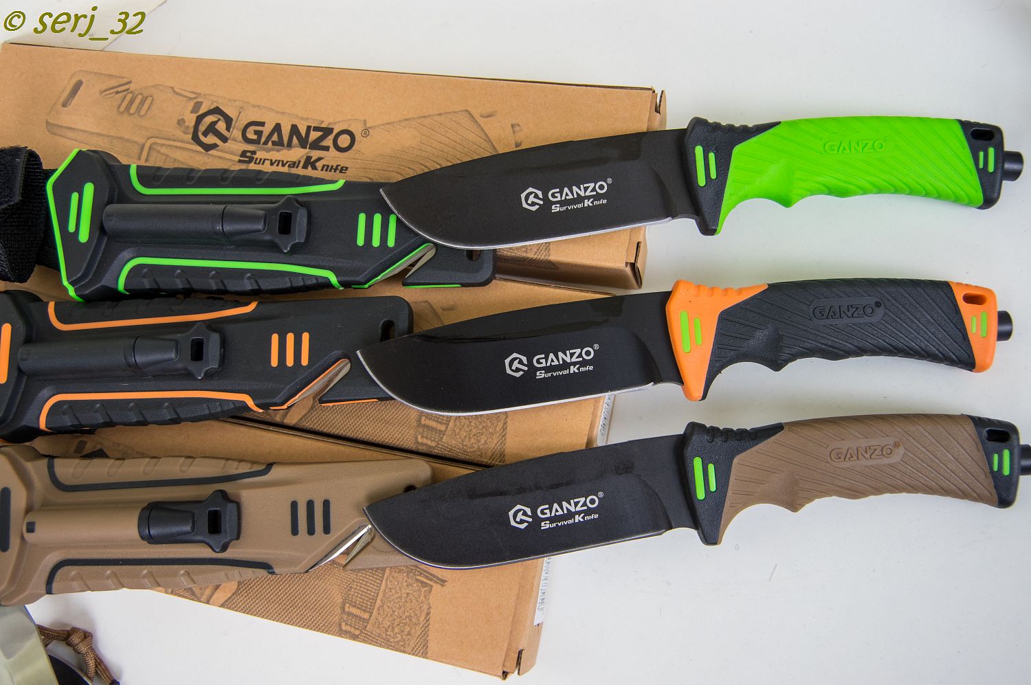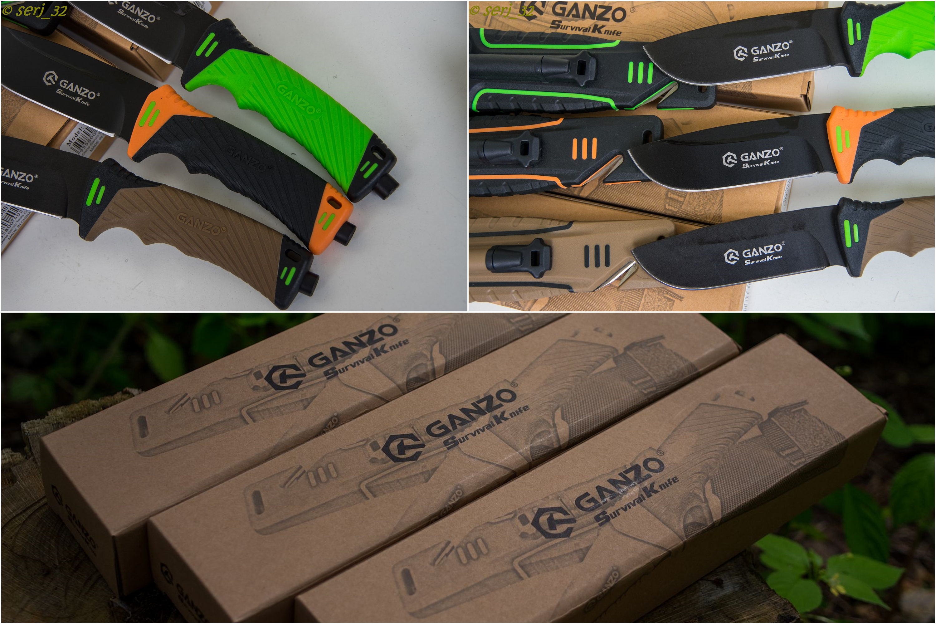 Нож поставляется в картонной коробке, похожей на коробки первых складных моделей компании Ganzo. На сегодняшний день, есть 3 цветовых решения: песчаный (коричневый) + черный, оранжевый + черный, зеленый + черный.