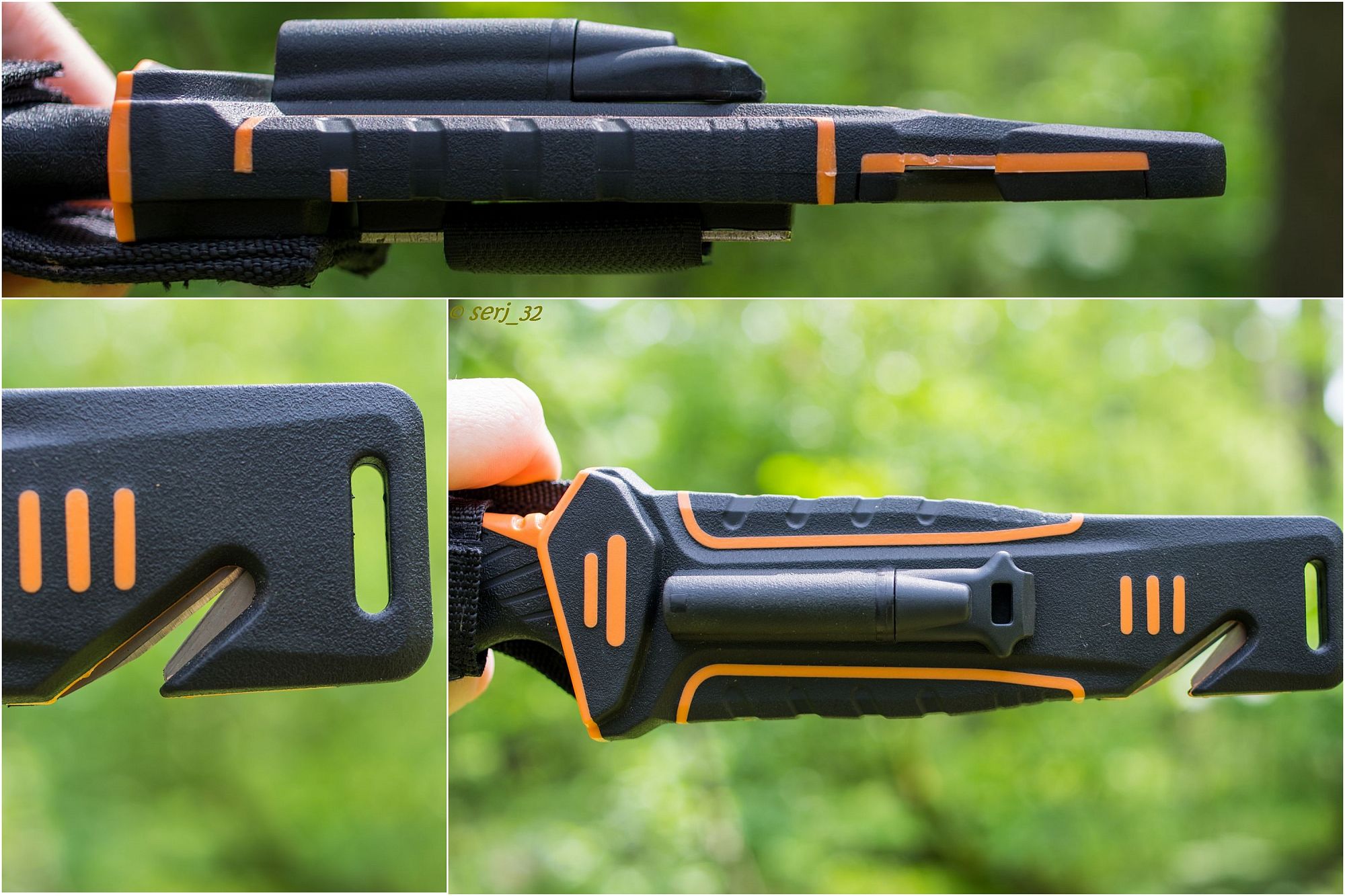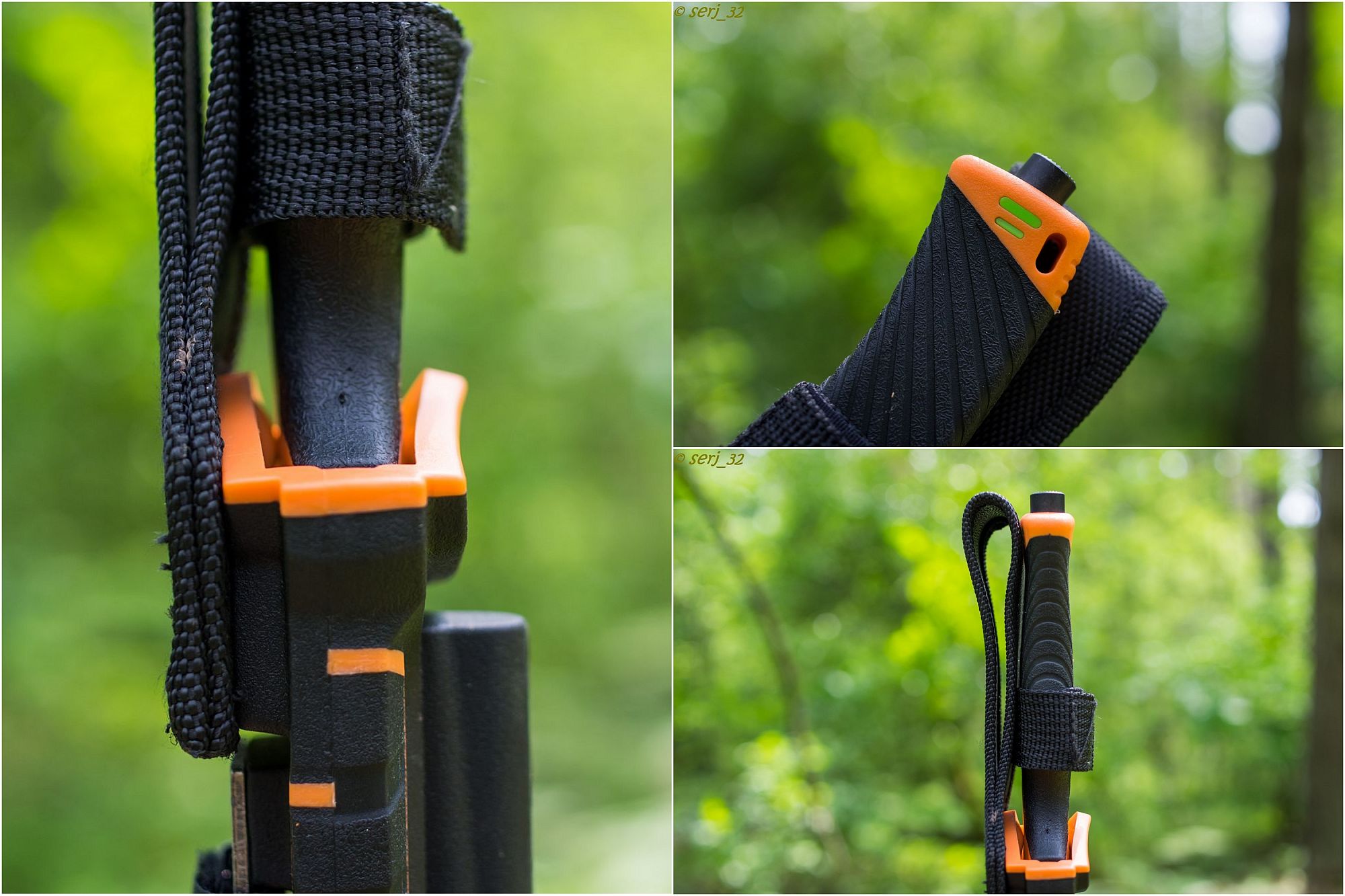 Еще, в ножнах есть стропорез. Выполнен он в виде двух закрепленных лезвий. Режет веревки, ремни, тонкие ветки. При необходимости, стропорез делает очень удобные зубочистки. Лезвия утоплены, и если специально не засовывать внутрь пальцы, им не порезаться. Наличие стропореза удлиняет ножны примерно на 2,5 см.