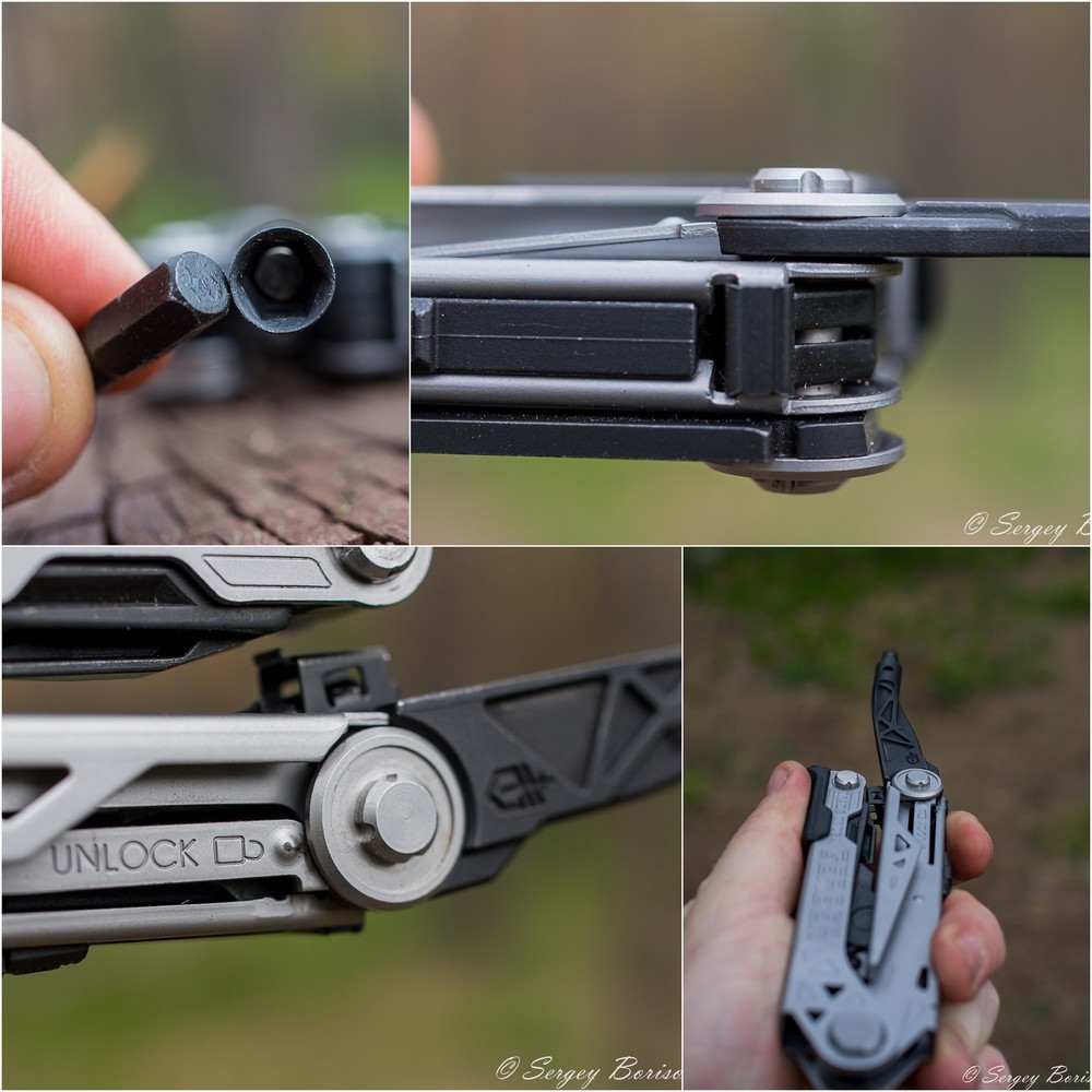 Все эти инструменты фиксируются в открытом положении замком. Для разблокировки, необходимо сдвинуть черную пластиковую накладку замка и сложить инструмент.