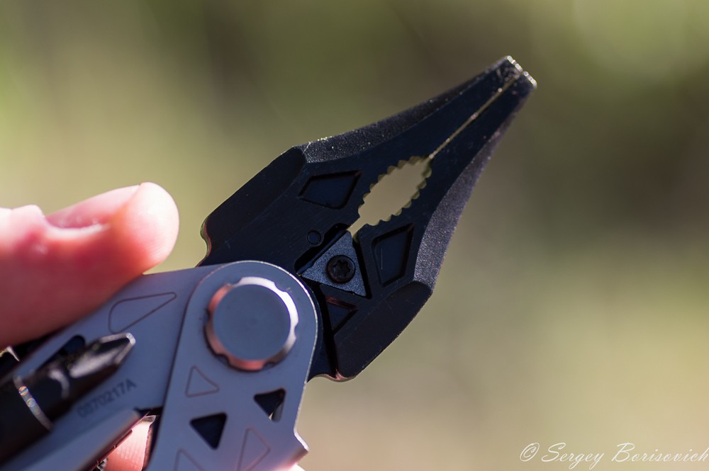 Плоскогубцы - выдвижные. В отличии от старых моделей, тут только одна кнопка блокировки в открытом положении. В закрытом, блокировки нету, но самопроизвольное открытие практически не возможно. Кроме выдвижения плоскогубцев, привести их в рабочее положение можно при помощи резкого взмаха руки.