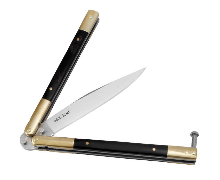 Клинок. Для ножа-бабочки оптимальной будет гладкая заточка по всей длине режущей кромки. Полусеррейторная или серрейторная считаются более травмоопасными для данного типа ножей. Да и к тому же, не подходят для балисонга, так как такой тип заточки подразумевает выполнение тяжелых работ, а вот конструкция «бабочек» явно не рассчитана под такую эксплуатацию.
