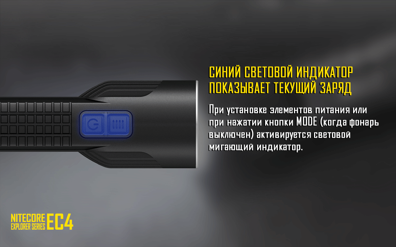 В кнопку включения интегрирован синий световой индикатор, который способен показать степень зарядки аккумулятора. Чтобы узнать количество заряда, достаточно нажать кнопку MODE, когда фонарь выключен. Три варианта индикации, отображающих степень заряда: