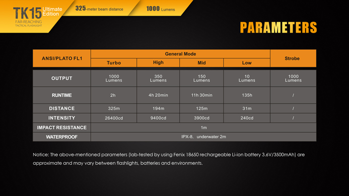 Основным техническим новшеством для модели TK15UE стало использование диода XP-L HI V3 все того же американского бренда Cree. Он позволяет получить яркость света 1000 люмен и работает так же долго, как и другие полупроводниковые продукты этого бренда — 50 тысяч часов. По сравнению с редакцией этого же фонаря на диодах XP-G (R5) и XP-G2 R5 прирост яркости более чем впечатляет. Работает фонарь в пяти режимах, все из которых дают свет белого цвета. В то же время, у выпущенного ранее TK15С были 4 дополнительных режима, использующие неяркие красный и зеленый диоды. Хотя и эта модель могла похвастать лишь 450 люменами белого света. Как вывод, TK15UE адресован тем пользователям, которым необходима, в первую очередь, большая яркость. Что же касается дополнительного цвета, то решить проблему помогут съемные фильтры.