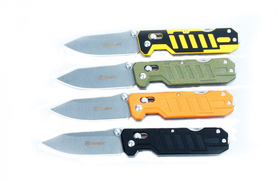 Длина открытого ножа вместе с рукояткой составляет 20,5 см. Ручка Ganzo G735 сделана из G10 — популярного ныне термопластика. Он стал широко использоваться для ножей как складной, так и фиксированной конструкции благодаря тому, что этот материал прочнее обычных пластиков. В то же время, он легко формируется и окрашивается в любой цвет. Кстати, в данной модели четыре варианта окраски: оранжевый, черный, зеленый и комбинированный желто-черный. Поэтому можно выбрать как незаметный на природе нож, так и хорошо видимый на любой поверхности.