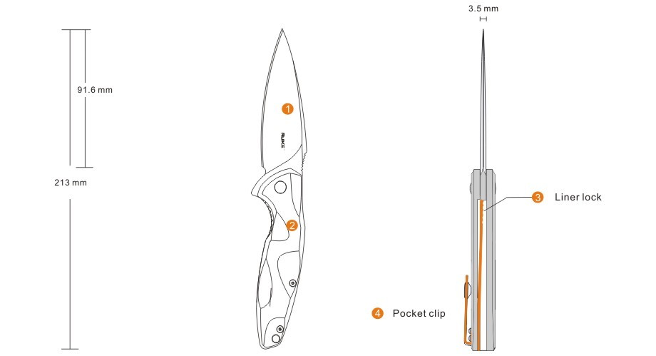 У ножа Ruike P105 надёжный замок Liner. Пластина из стали отлично запирает пяту клинка, а потому он не закроется во время работы. Кроме того, этот замок очень простой в использовании и его можно закрывать и открывать одной рукой.