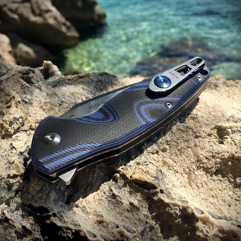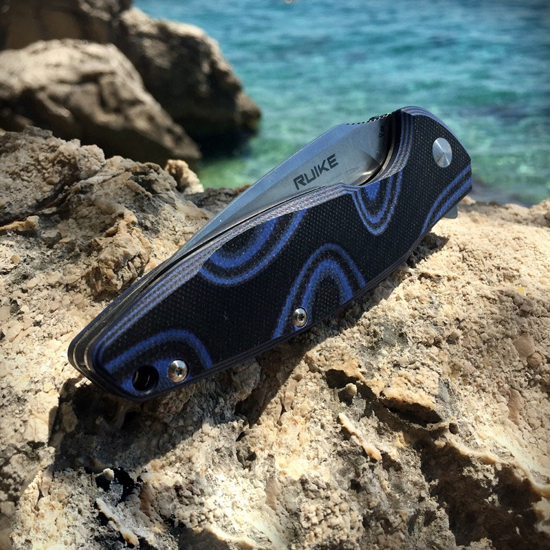 У рукоятки ножа Ruike P105 прямоугольное сечение, выполнена она в сложной форме, но при это в простой конструкции. Она удобная и полностью заполняет ладонь, а также совершенно не проскальзывает из-за текстурированной поверхности. Лайнеры рукоятки высверливаются и разделяются спейсером, а потому конструкция получилось жёсткой. Сверху они накрыты плашками из G10. Накладки обработаны таким образом, что внутренние слои становится видно, что создаёт симпатичный объёмный рисунок на рукояти синего (версия -Q) или серого (версия -K) цвета.