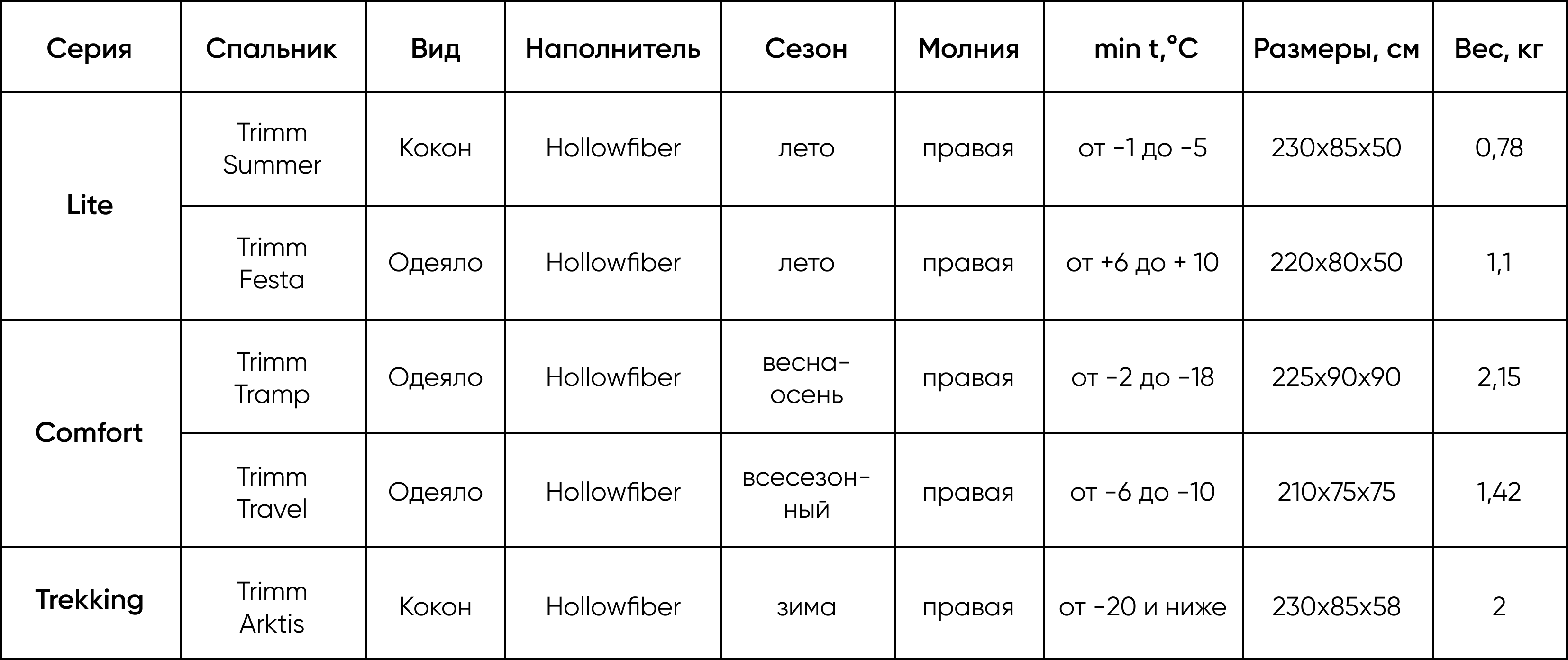 Теперь рассмотрим поподробнее, какие спальные мешки предлагает Trimm. Весь ассортимент разделен на серии, каждая из которых предназначена под разные потребности. Каждая линейка имеет свои особенности в типе, составе материалов и сезонности моделей. Разберем характерные черты всех серий, а также самых популярных моделей каждой из них.
