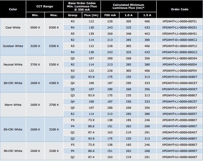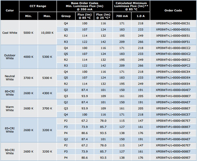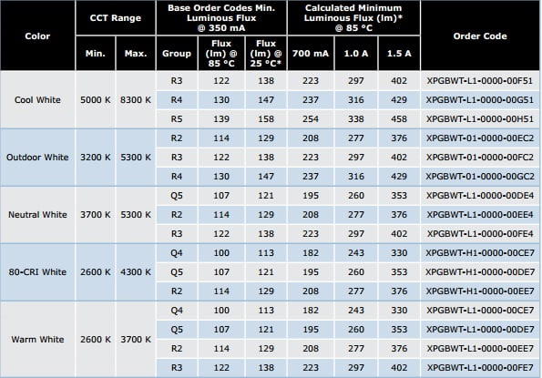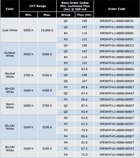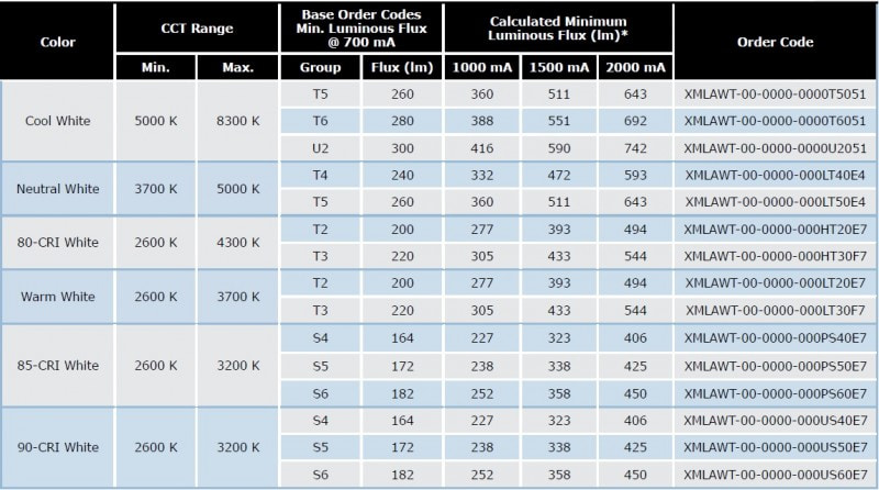 - R2 – отражает типа бина, который характеризует яркость. Он же – “flux bin” в англ.языке. Это значение рассказывает о том, сколько люменов (лм) способен выдать светодиод, потребляя 1 Вт энергии (350 мА). Сегодня часто встречаются обозначения Q2- Q5 (в линейке XR-E), R2-R3 (в XP-E), R4, R5 и S2 (в серии XP-G).