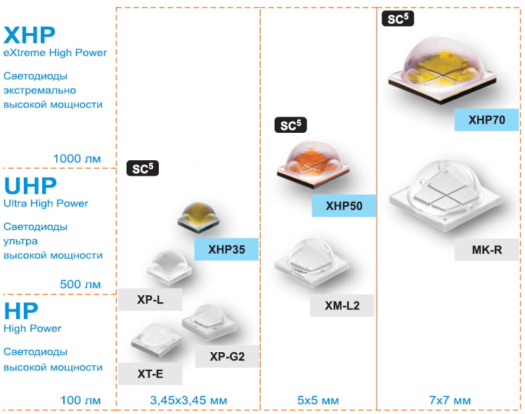 XHP - новые надежные и мощные светодиоды, превзошедшие предшественника (XM-L). Здесь компания CREE использует новый тип обозначения, не схожий с традиционным. XHP - аббревиатура, сокращенно от Extreme High Power, а числовая приставка 35/50/70 указывает на размеры корпуса. Так, новая линейка светодиодов дублирует уже имеющиеся параметры: XHP35 - повторяет размеры диодов XP-G2, XT-E, XP-L, равные 3,45×3,45 мм, XHP50 схож с XM-L2, параметры - 5,0×5,0 мм, а габариты XHP70 одинаковы с MK-R (7,0×7,0 мм). Светодиоды этой линейки обеспечивают увеличение потока света более, чем в два раза. При этом они совместимы со стандартными печатными платами и оптикой. Совместимость и сила светового потока определенных моделей отражены ниже на графике.