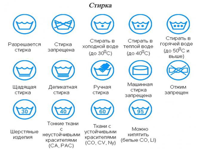 Если на ней содержится изображение ванночки с водой без каких-либо цифр, то такое термобелье можно стирать исключительно вручную. Чаще всего это предостережение касается моделей, содержащих натуральные волокна животного происхождения, как шерсть. Изображение ванночки уже с температурой указывает на порог, который нельзя превышать как при ручной, так и машинной стирке. Если под ванночкой имеется дополнительная горизонтальная черта, значит полоскать белье можно только в холодной воде, а отжим должен быть деликатным. Запрещающие символы всегда перечеркнуты. Например, перечеркнутый утюг означает запрет на глажку, круг – недопустимость химчистки, а круг, вписанный в квадрат, запрещает отжим и сушку в машине.