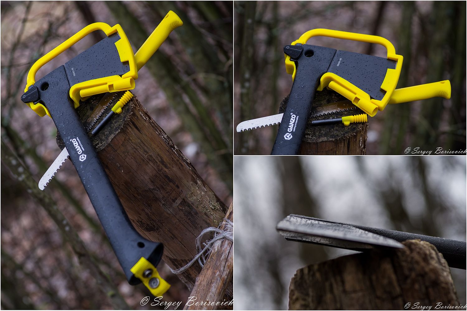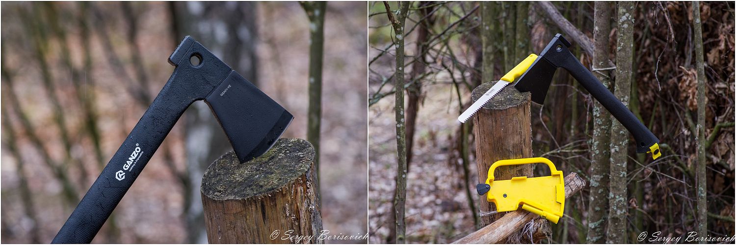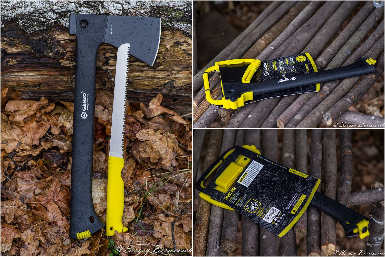 Многие, наверное, знакомы с туристическими топориками Gerber или Fiskars. Эти топоры представляют из себя стальное топорище и пластиковую рукоятку. Пластик обеспечивает легкость и технологичность изделия. Ganzo GSA-01ye - отличается еще там что у него есть огниво и пила по дереву в комплекте.