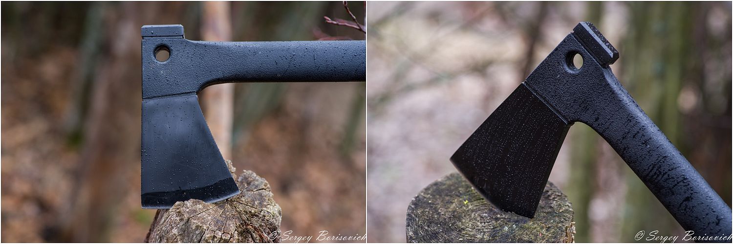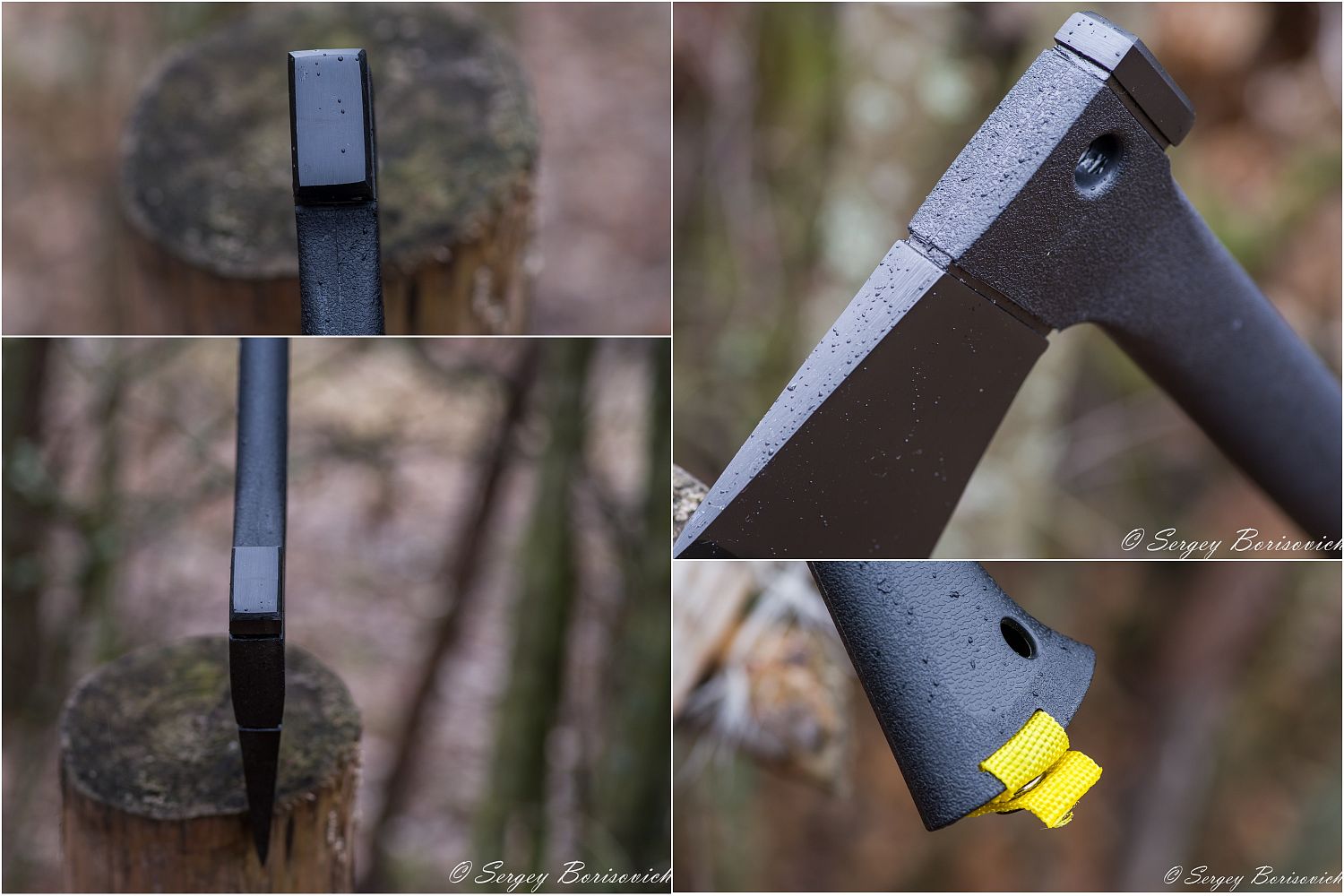 Голова топора выполнена из нержавеющей стали 3CR1. Заточка топора - хорошая, правда сведение немного не симметрично (некоторые модели ножей Ганзо также не лишены этого недостатка). Покрытие лезвия не сдирается при рубке (правда, насколько оно долговечно, покажет время). По габаритам, голова чуть массивнее, чем у Фискарса Х7. Баланс топора из-за такой головы чуть смещен к голове, в чем-то это облегчает рубку.