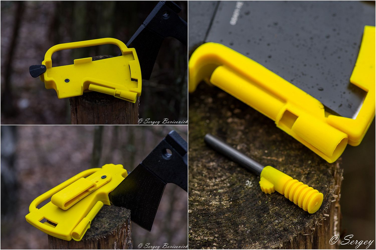 Топор выполнен в черном цвете. Ножны и рукоять пилы - желтые. Как по мне, то черный цвет - не самый лучший выбор. Топор такого цвета гораздо легче забыть где-то.
