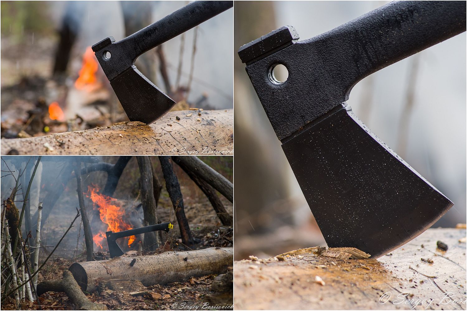 За счет заточки топора, он отлично рубит как сухую, так и мокрую древесину. Правда, при рубке без рабочих перчаток, рукоять довольно сильно отдает в ладонь. Все же материал рукояти отличается от Fiskars и он хуже гасит вибрации.